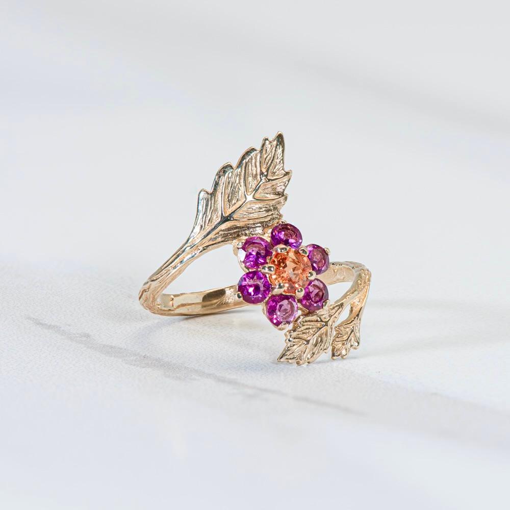 An eye-catching .22 pt. orange, natural Sapphire with six .08 pt. Umbalite Garnets in a 14k yellow gold leaf/flower setting. A future family heirloom. Pictured in size 7.