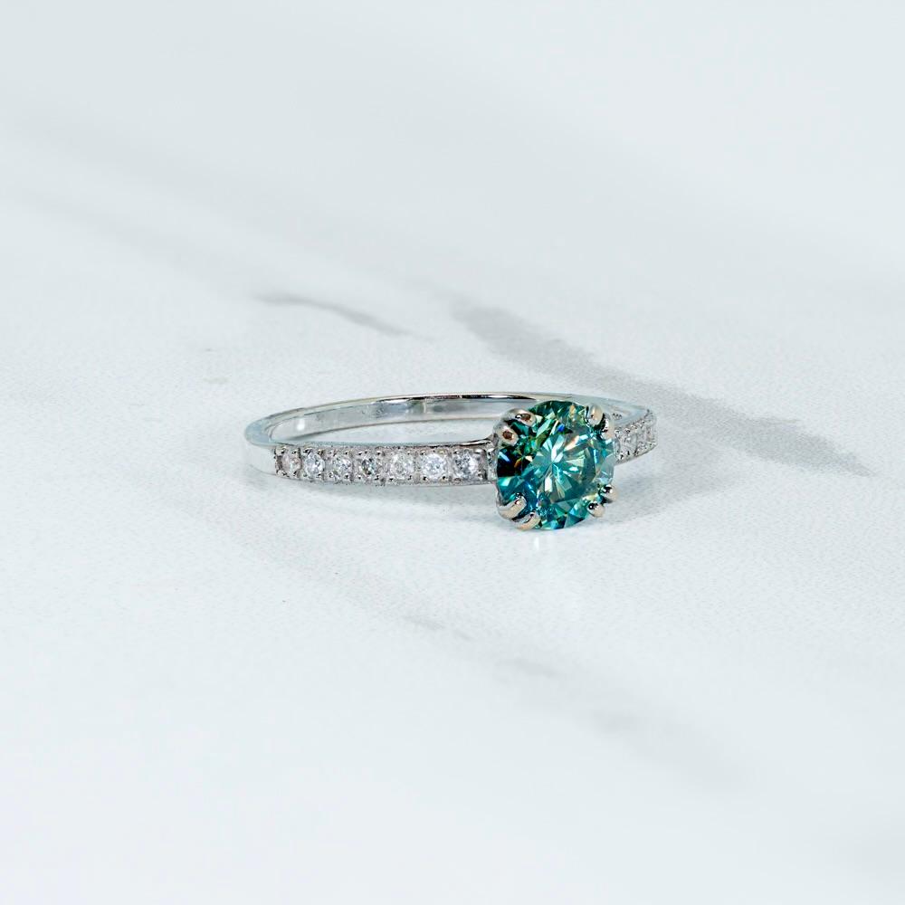 An elegant 0.85 carat blue green Moissanite with 14x 0.0125 pt. natural Diamonds in 14k white gold. Pictured in a size 7.