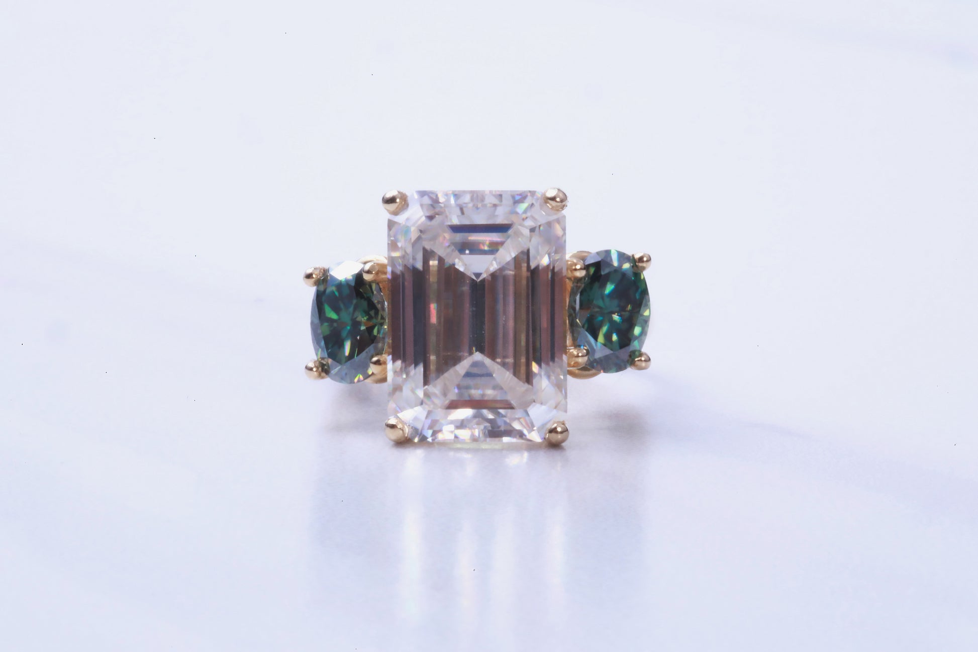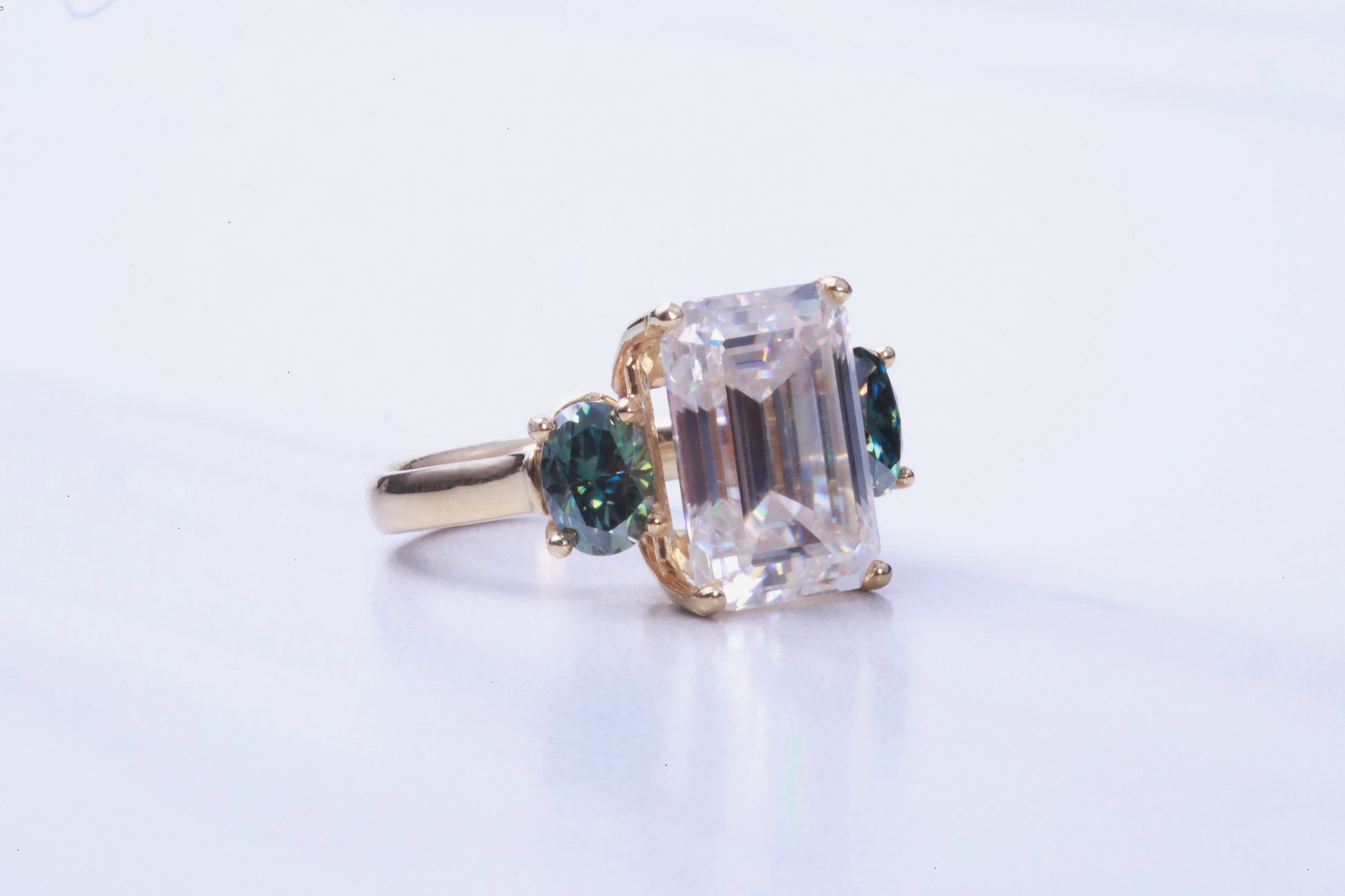 10.00 carat emerald step cut VVS-1 D-color white Moissanite with 2x 1.00 carat oval blue green Moissanite in 14k gold. Pictured in size 7.