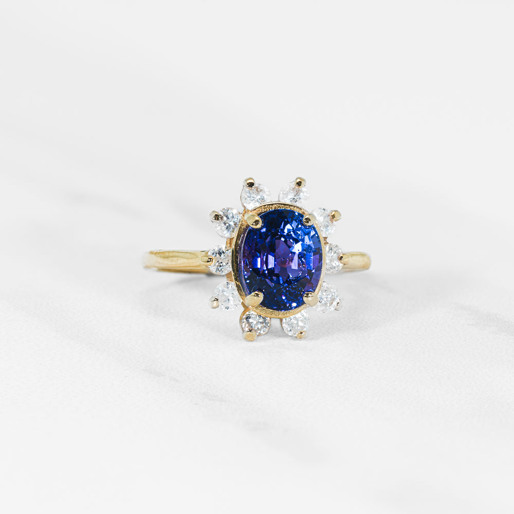 A gorgeous 2.77 carat natural peony blue Tanzanite surrounded amid ten 0.08 pt. SI-2 natural Diamonds in 14k yellow gold. Pictured in size 7.