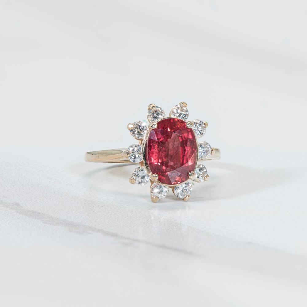 This lush 3.14 carat oval reddish orange natural red Sapphire is encircled by 10 x 0.08 pt. SI-1 G/H-color natural Diamonds in 14k yellow gold. Pictured in size 7.