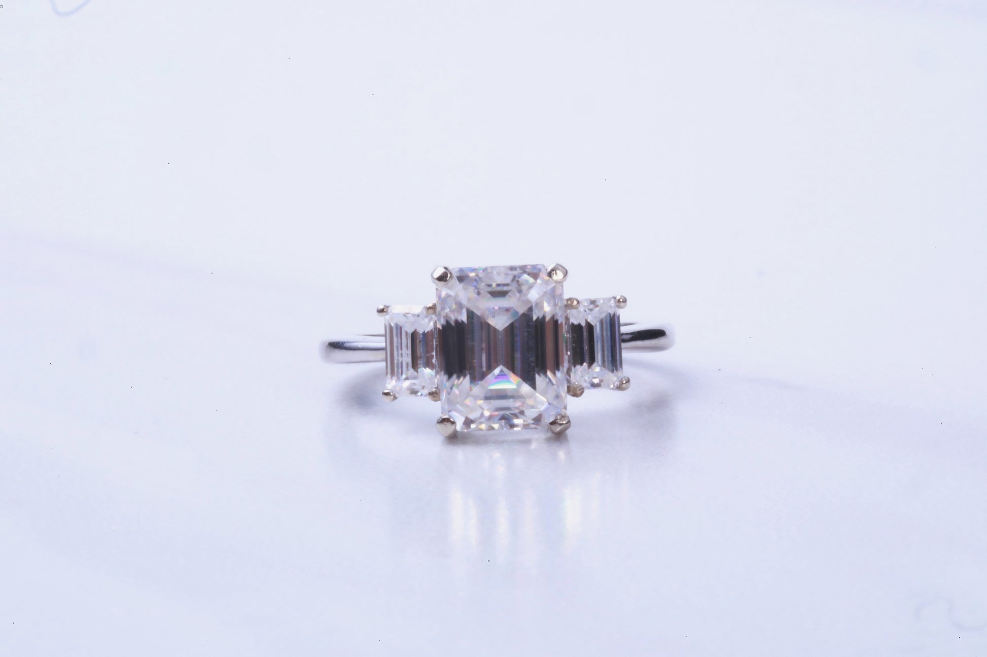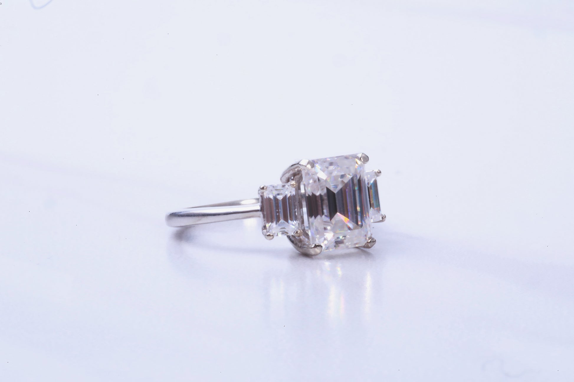 3.50 carat step cut VVS-1 D-color white Moissanite with 2x 0.40 pt. VVS-1 D-color white Moissanite in 14k white gold. Pictured in size 7.