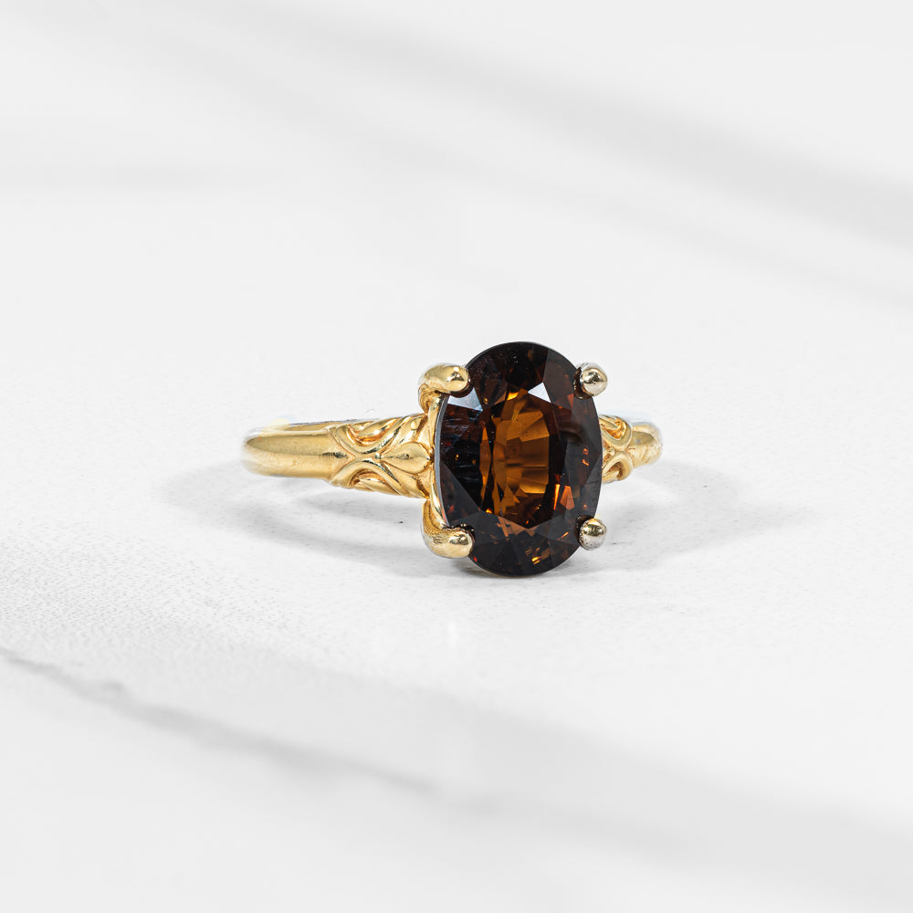 An Impressive 4.00 carat oval natural bi-colored Tourmaline in a decorative 14k yellow gold mounting that marvelously changes color in different lighting. Pictured in size 7.