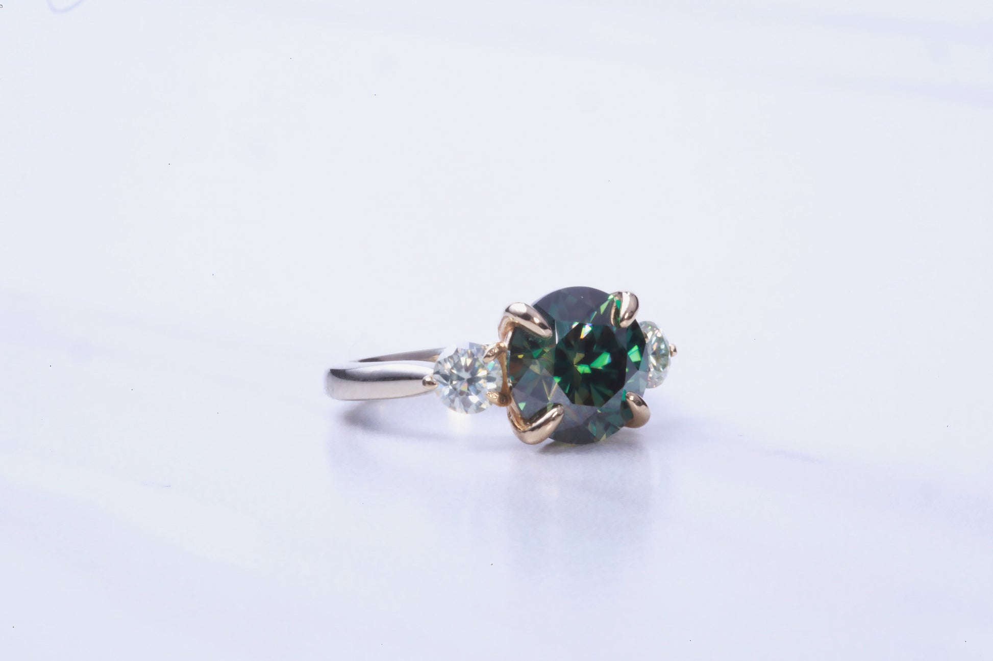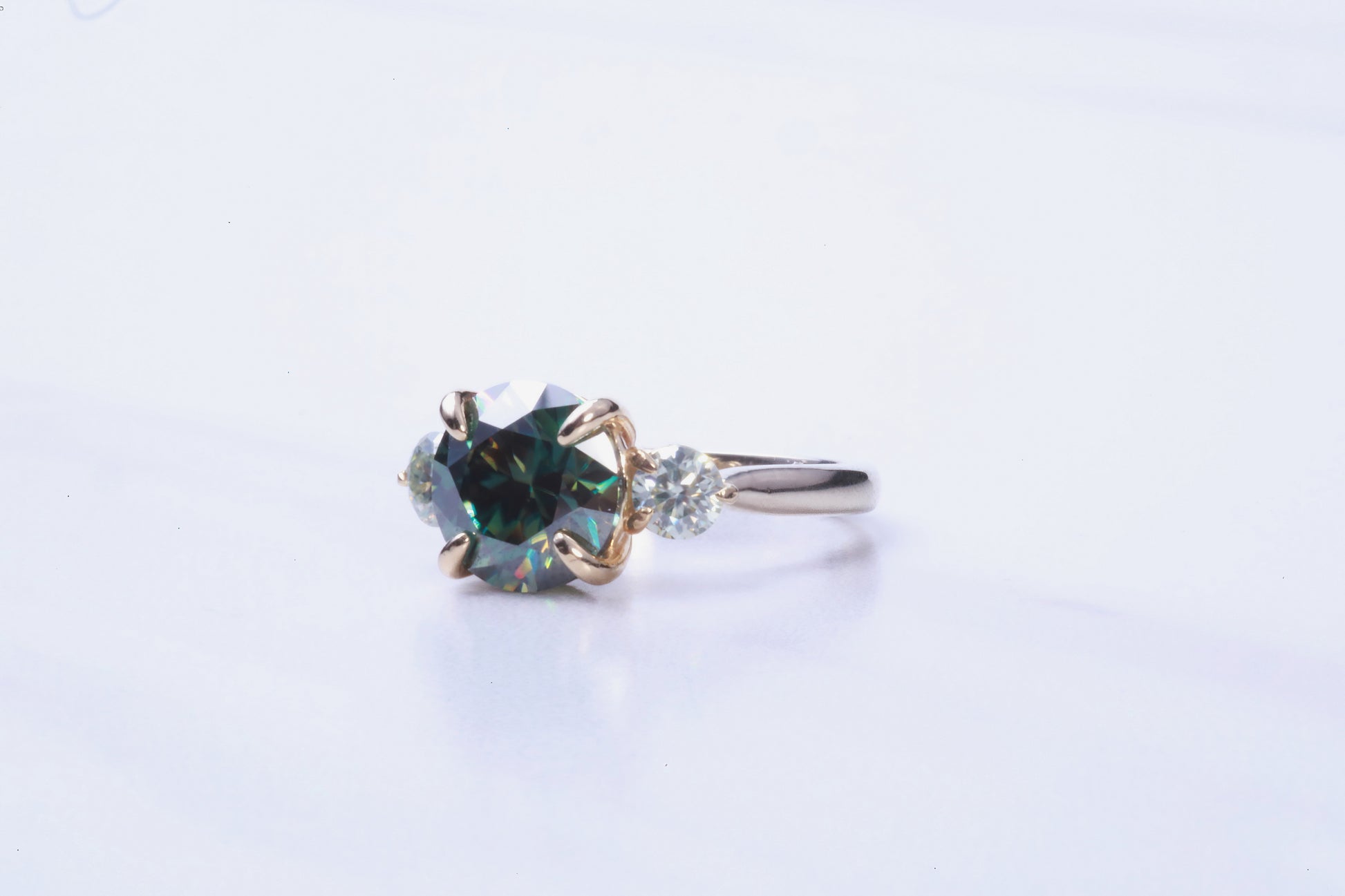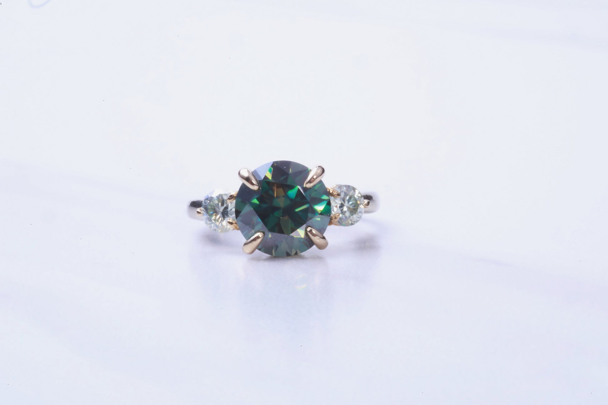 An impressive 4.00 carat (10mm) blue-green (with golden flair) Moissanite is mounted with claw prongs is set in the center of two 0.45 pt. white Moissanite. This setting is a 2-toned 14k white and yellow gold setting. Pictured in size 7.