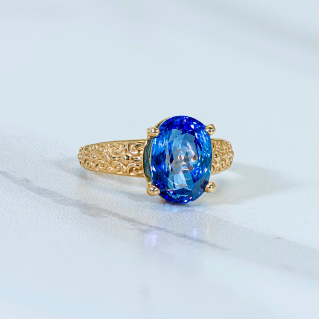 A spectacular 4.26 carat certified Chanthaburi Tanzanite in a 14k gold scrolled setting. Pictured in size 7.