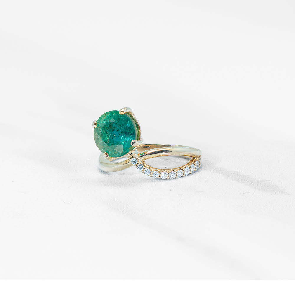 A stunning 4.80 carat natural Emerald (Colombian) is accented with 0.35 ctw. (carat total weight) of natural Diamonds in 14k yellow gold. Pictured in size 7.