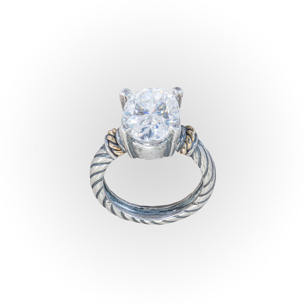 8.00 carat oval VVS D-color white Moissanite in Sterling Silver with heavy 14k gold rope highlights. Pictured in size 7.