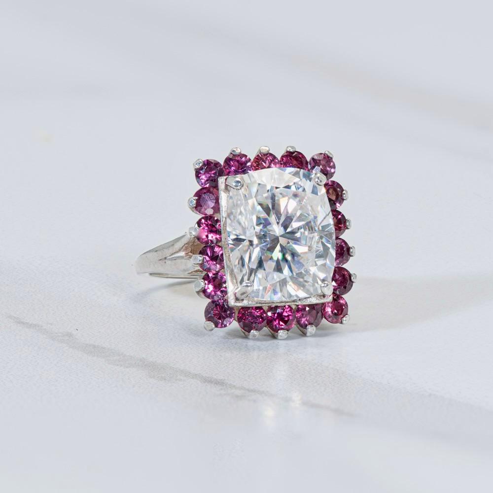 8.00 carat elongated cushion cut white Moissanite with 18x 0.08 pt. natural red Sapphires in Sterling Silver. Pictured in a size 7.
