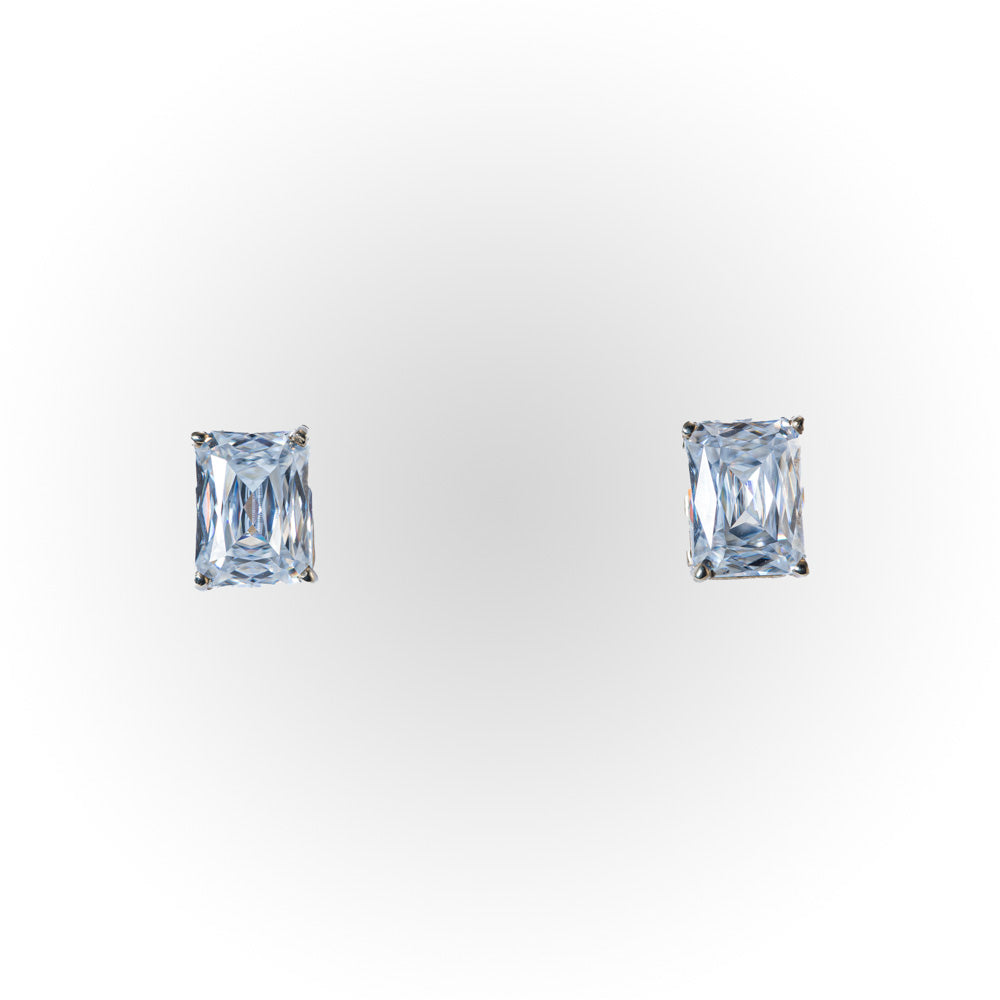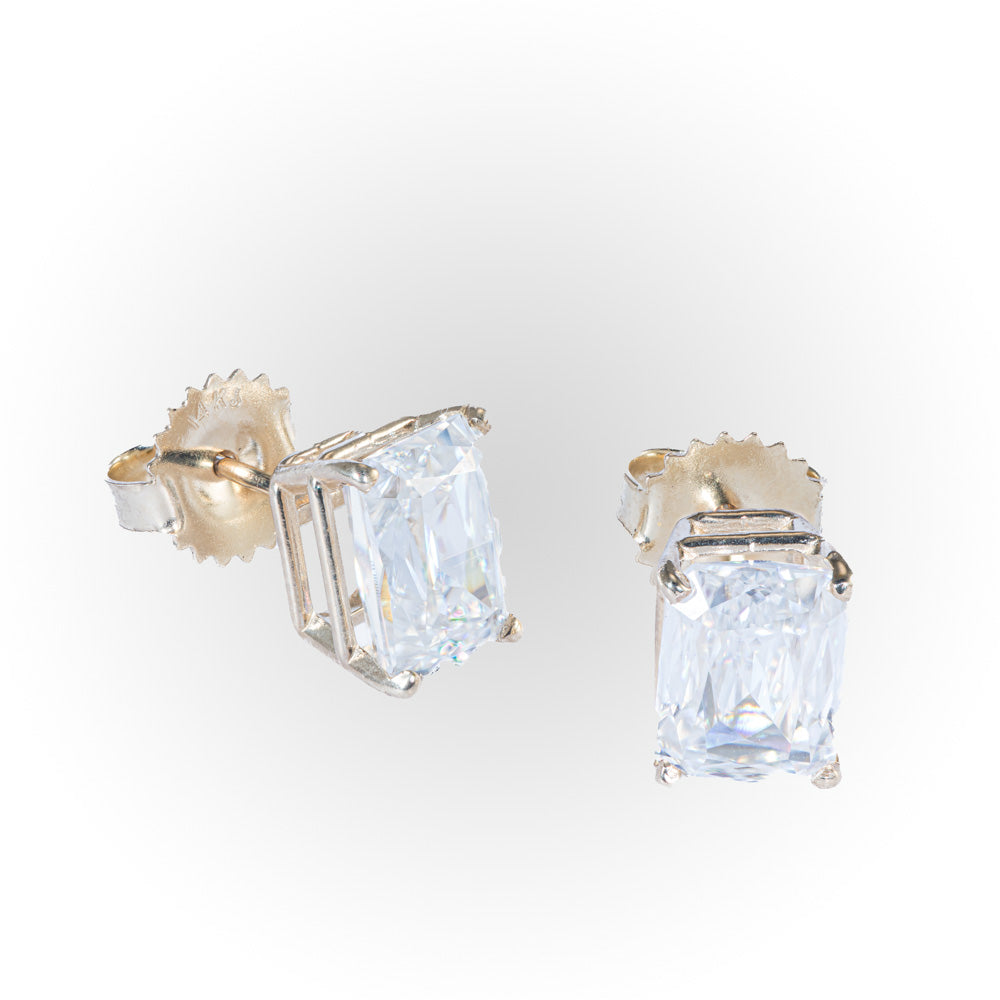These glimmering and stunning 4.0ct ttwt-7x9mm, "Ashoka cut" white Moissanites are mounted in four-pronged basket stud settings in 14kt gold.