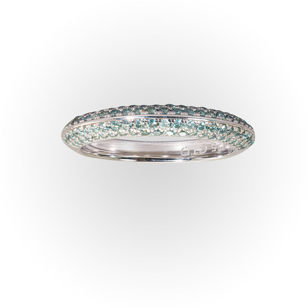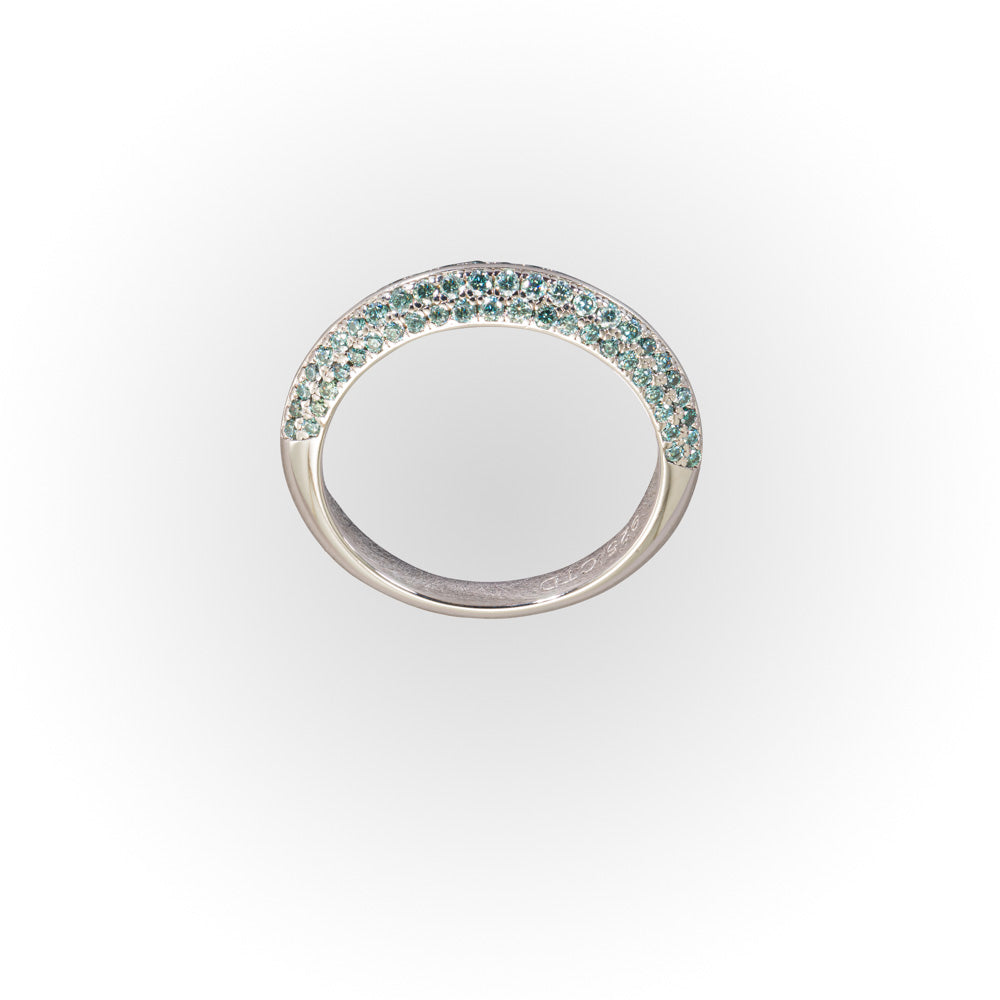 Pave blue green Moissanite in a Sterling Silver setting with a platinum overlay to negate tarnishing. Pictured in a size 7.