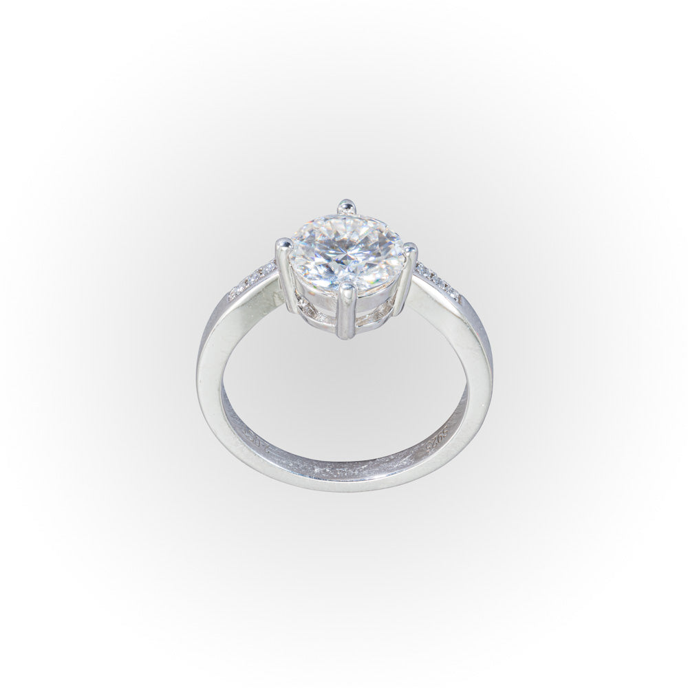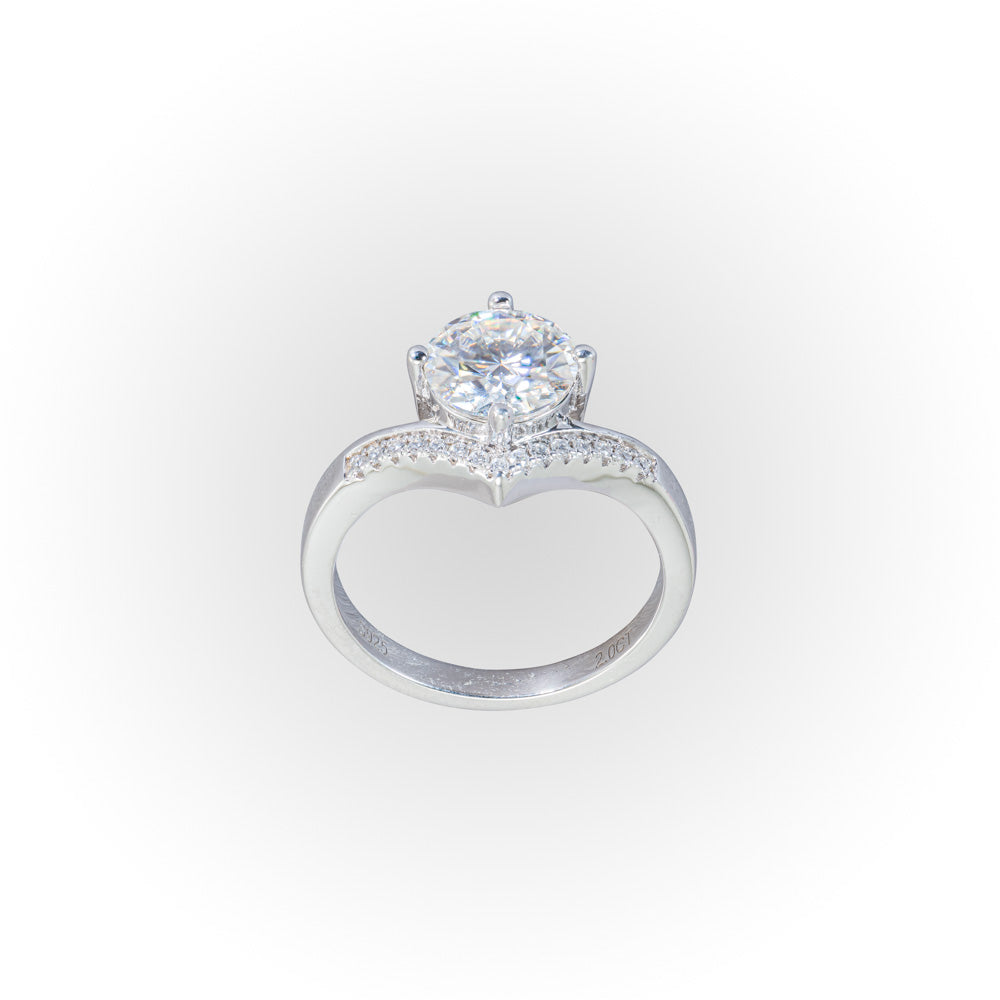 2.00 carat white Moissanite in a Sterling Silver chevron setting with a platinum overlay to negate tarnishing. Pictured in a size 7.