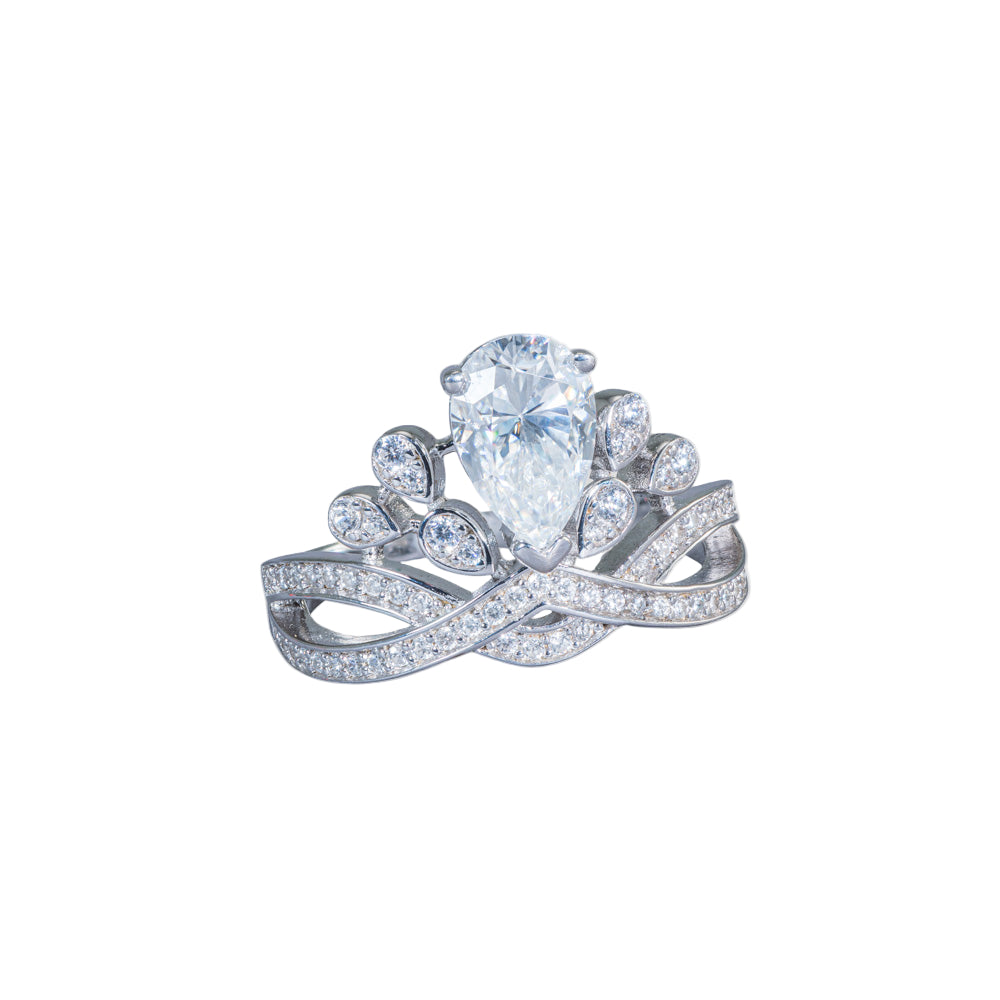 Showcasing 2.5 carats total weight of white Moissanite in a crown tear shape set in Sterling Silver with a platinum overlay to negate tarnishing. Feel like royalty! Pictured in a size 7.