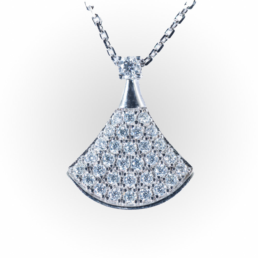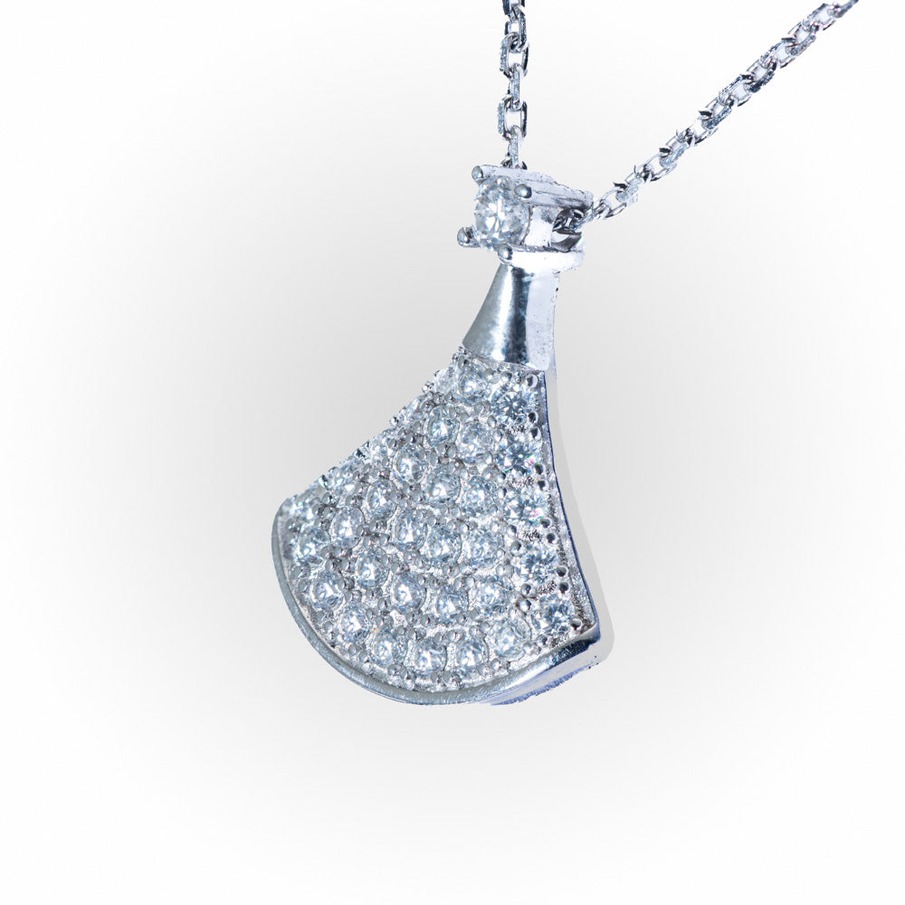 Pave white Moissanite in Sterling Silver with a platinum overlay to negate tarnishing. The piece includes a Sterling Silver stations chain that adjusts to lengths of 16"/18"/20".
