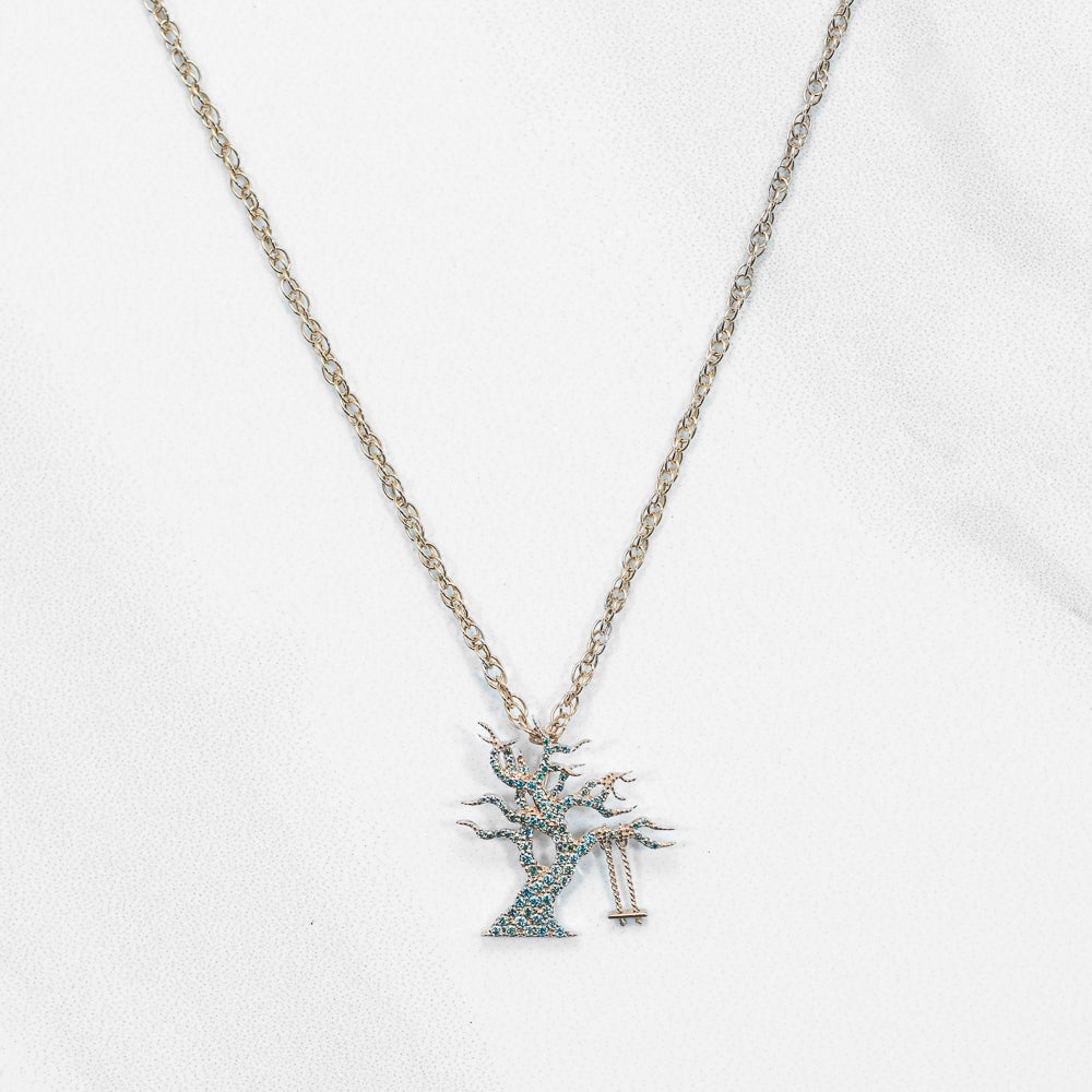 Based off the first piece Carl ever created at age 15, this one-of-a-kind pendant is made of 14k yellow gold and inlaid with beautiful pave blue green Moissanite. The pendant includes a 14k yellow gold 18" or 20" chain.