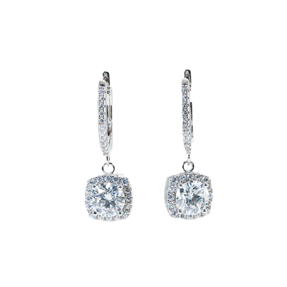 Dancing 3.00 carat total weight white Moissanite huggie earrings. The center stones are 1.0ct each and accented with 1.0ct stones. Available in Sterling Silver with a platinum overlay to negate tarnishing and 14k white and yellow gold. Also available slightly smaller with 2.5cts ttw.