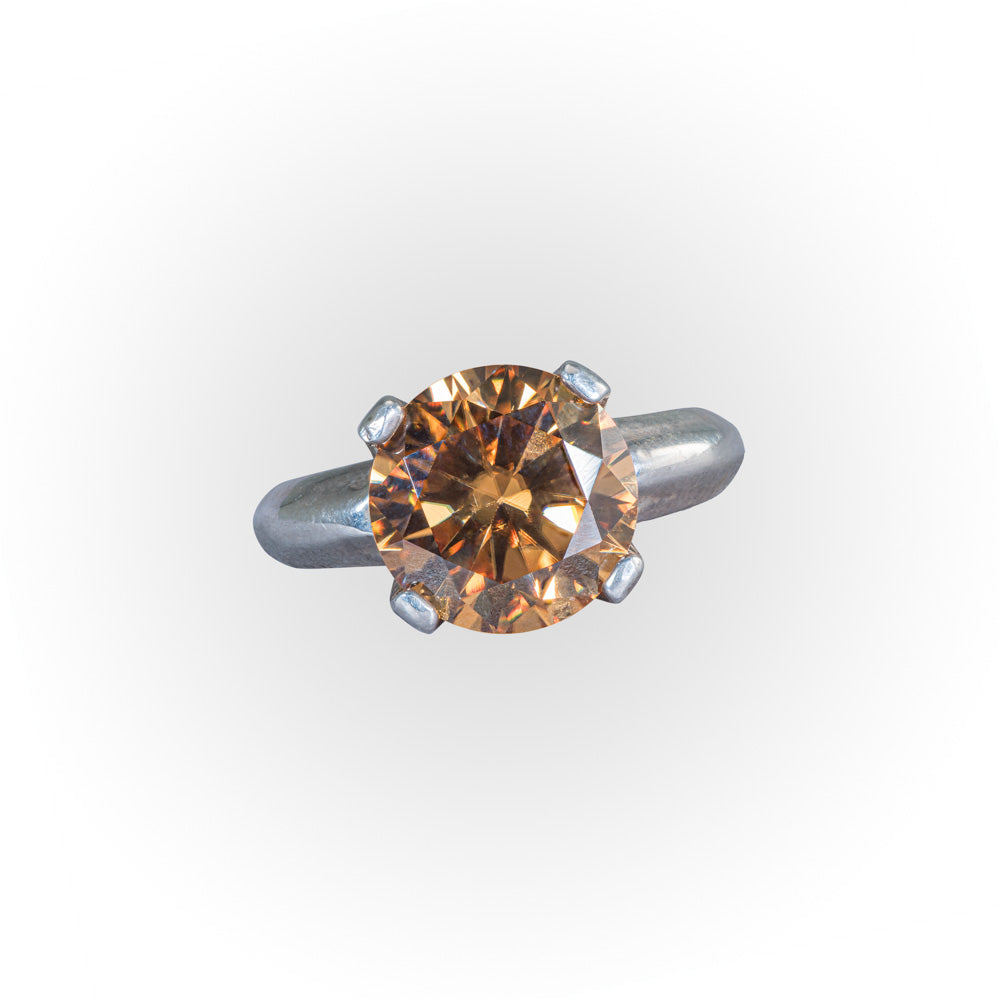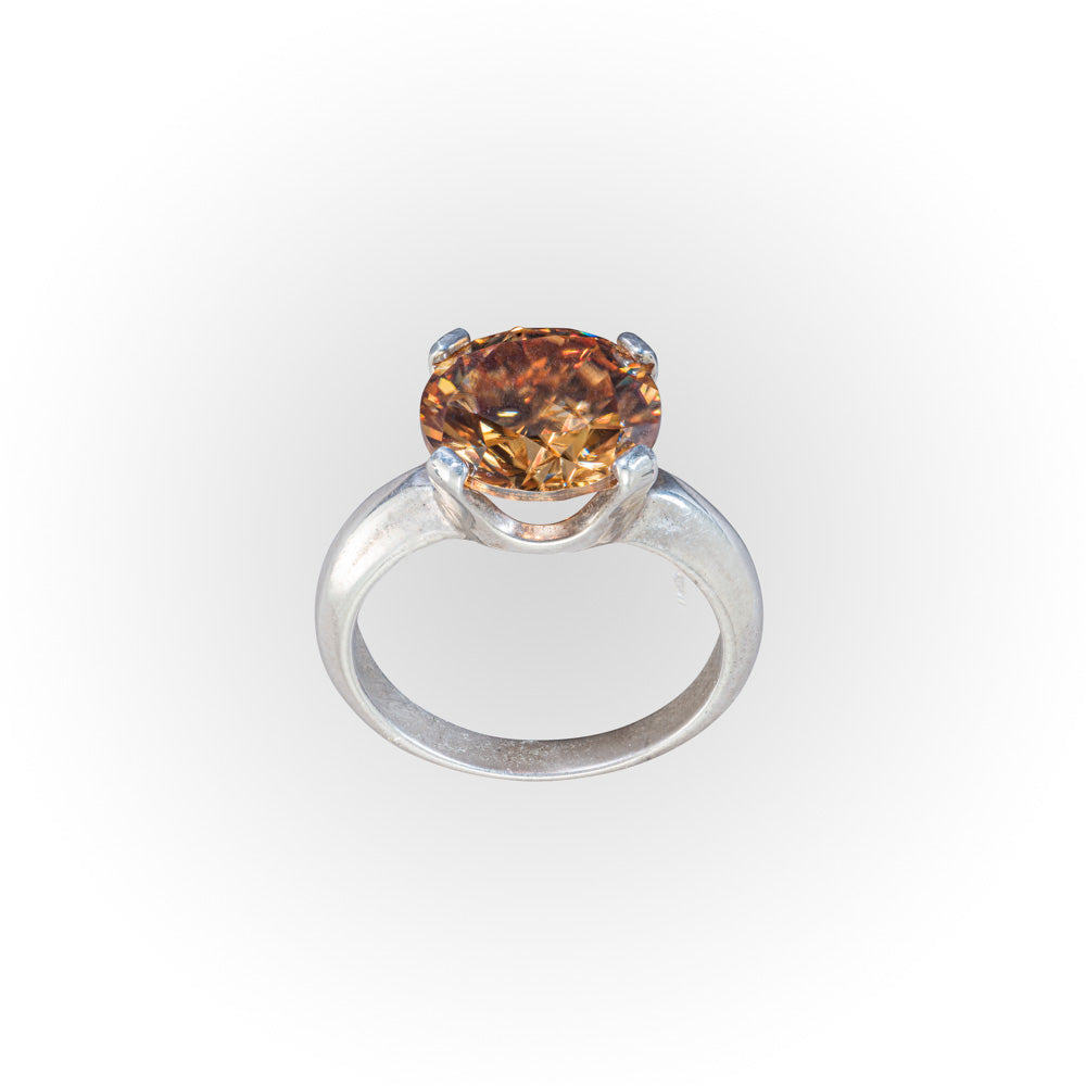 5.00 carat unusual Madeira citrine colored Moissanite set in Sterling Silver. Pictured in a size 7.