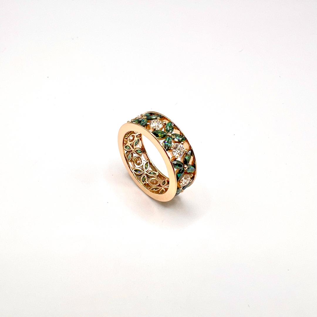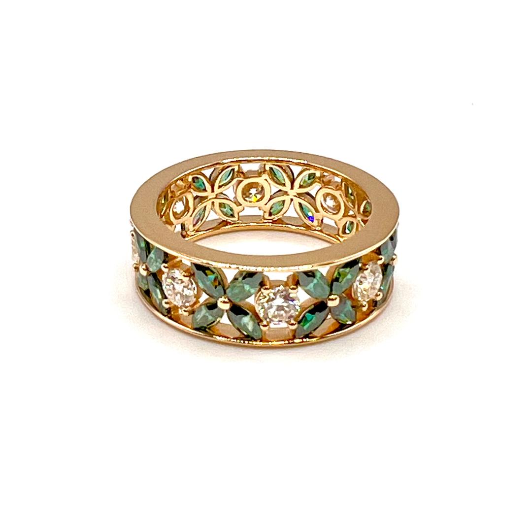 Marquise blue green Moissanite with white round Moissanite in 14k yellow gold. All marquise gems are channel set, all round gems are prong set for an easy comfortable fit.