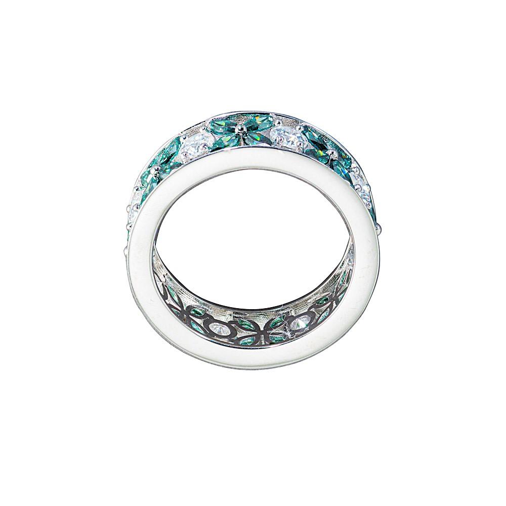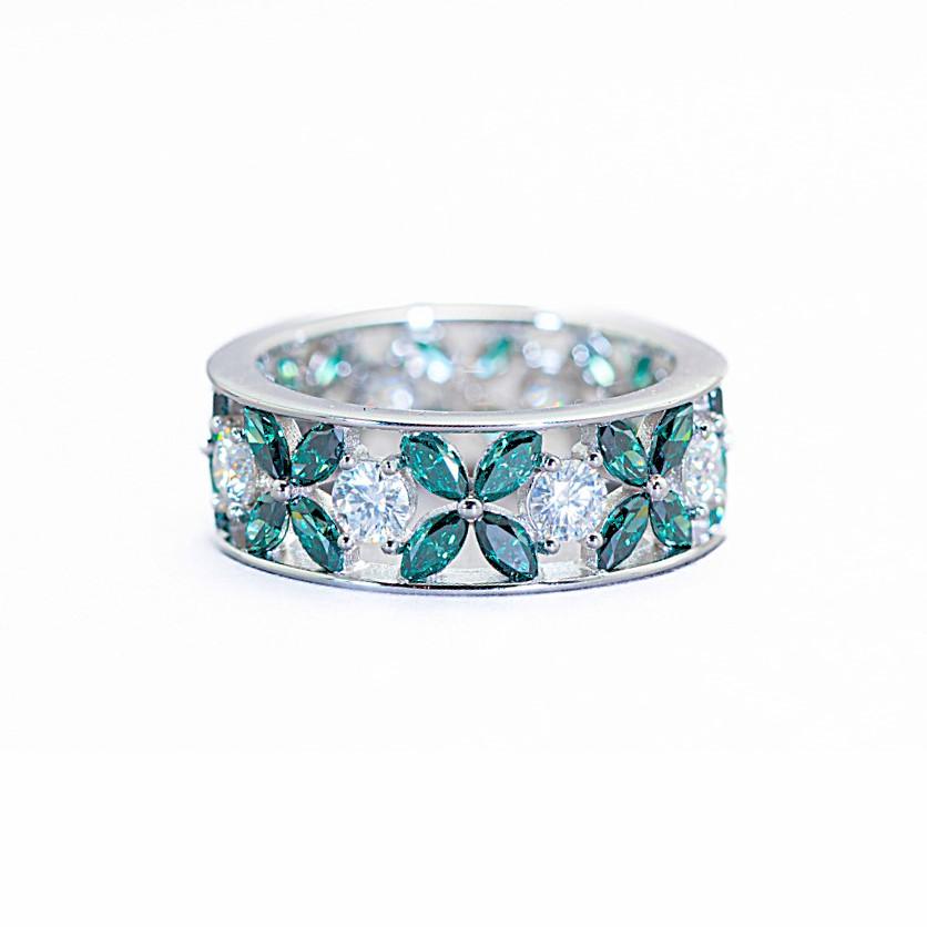 Marquise blue green Moissanite with white round Moissanite in a comfort fit setting. Available in Sterling Silver with a platinum overlay to negate tarnishing and 14k white gold.