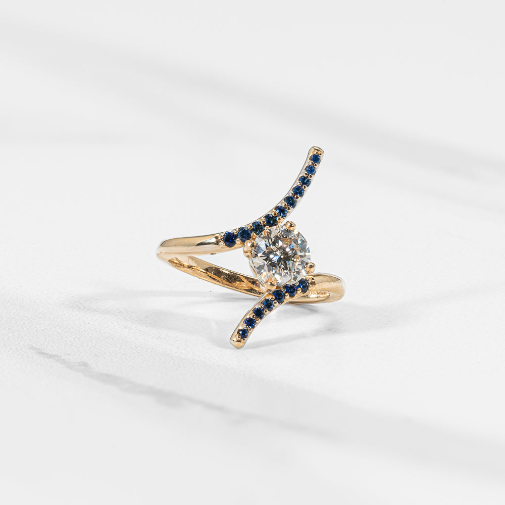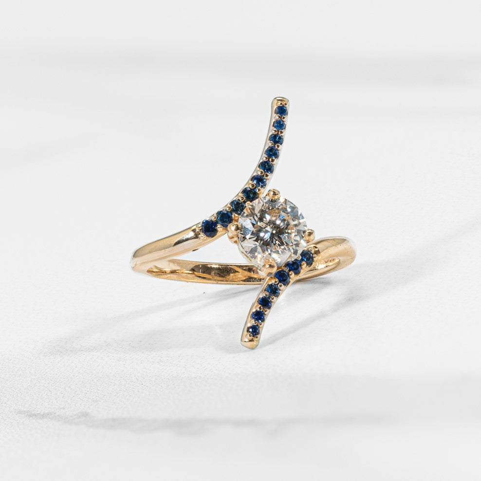 An exquisite 1.00 carat IGL certified fancy yellow SI-1 natural Diamond with cascading accented natural Ceylon Sapphires in a unique 14k yellow gold north-south setting. This is sure to become one everyone wants! Pictured in a size 7.