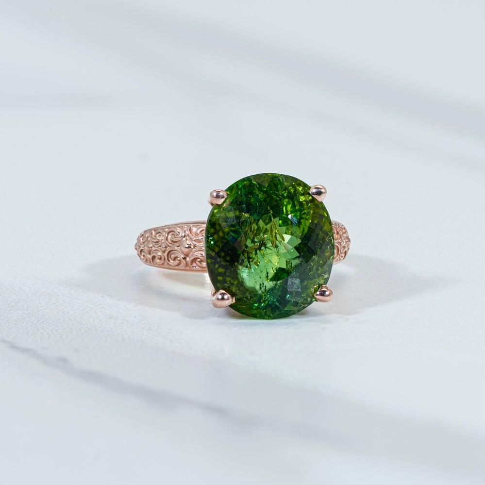 This stunning 10.57 carat large natural unheated copper bearing neon green Tourmaline from Madagascar is mounted in a 14k decorative rose gold hand scrolled setting. Pictured in a size 7.