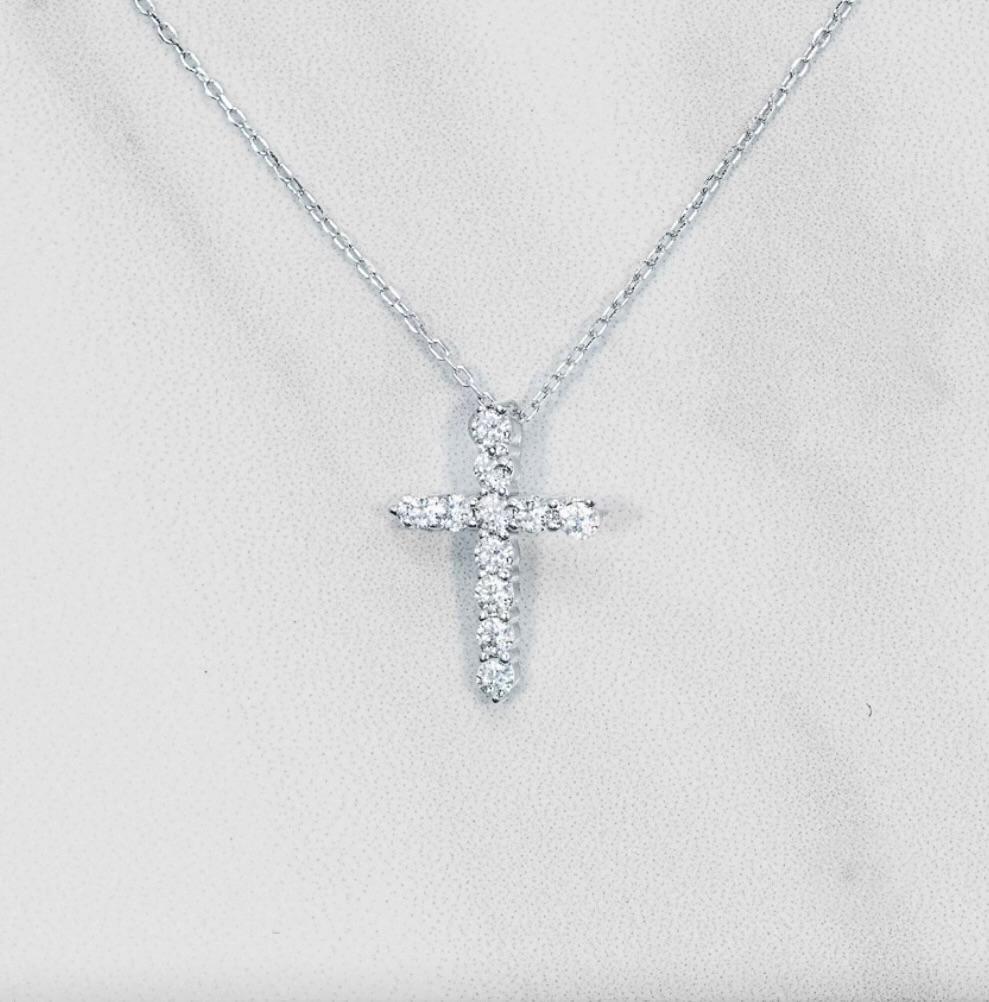 This lovely petite cross features 0.50 ctw. (carat total weight) of white Moissanite in a Sterling Silver setting with a platinum overlay. The piece includes a Sterling Silver stations chain that adjusts to lengths of 16"/18"/20"