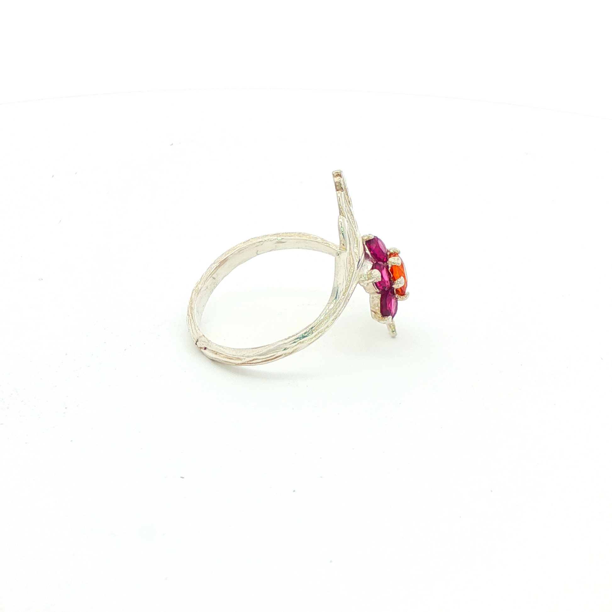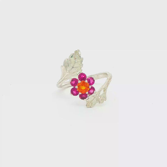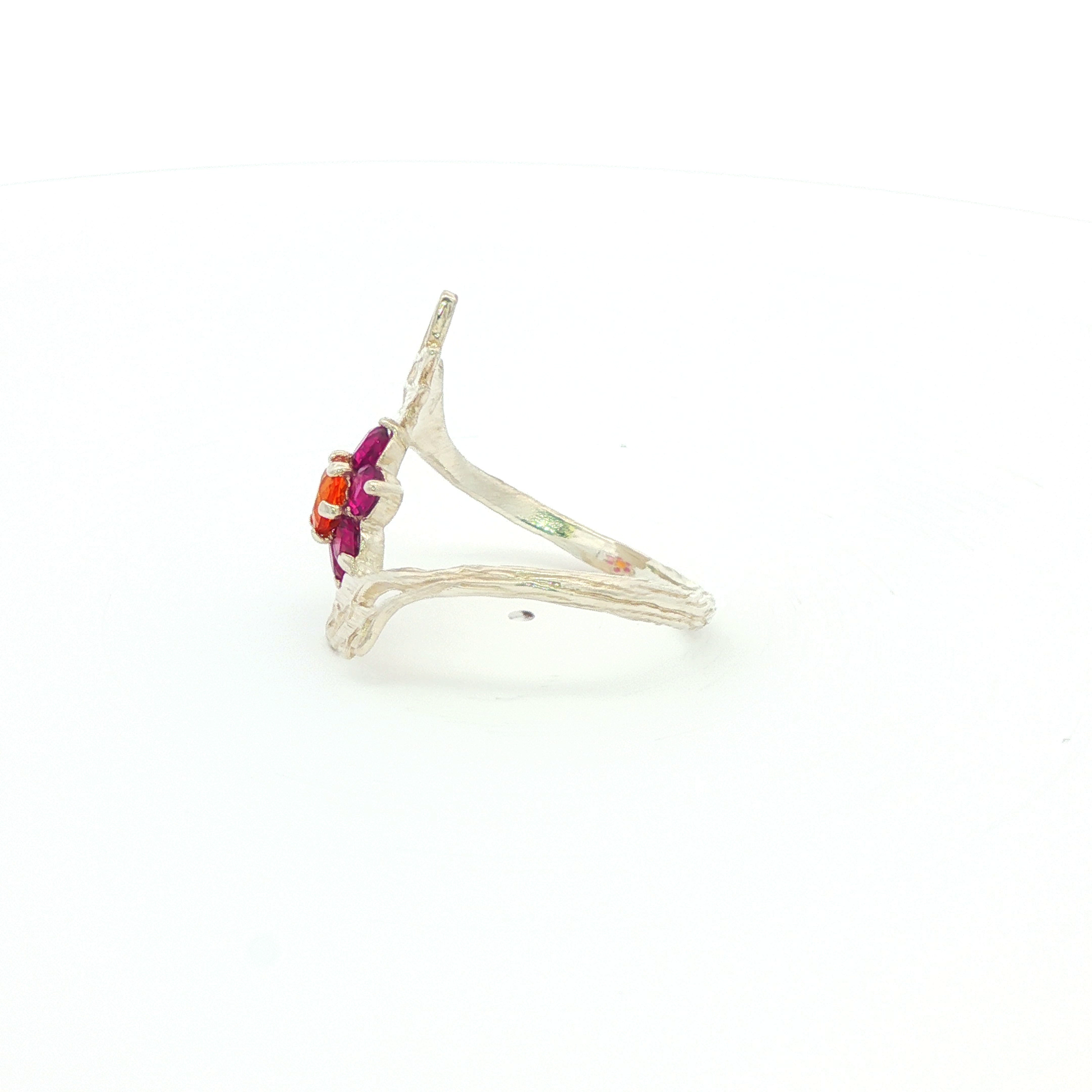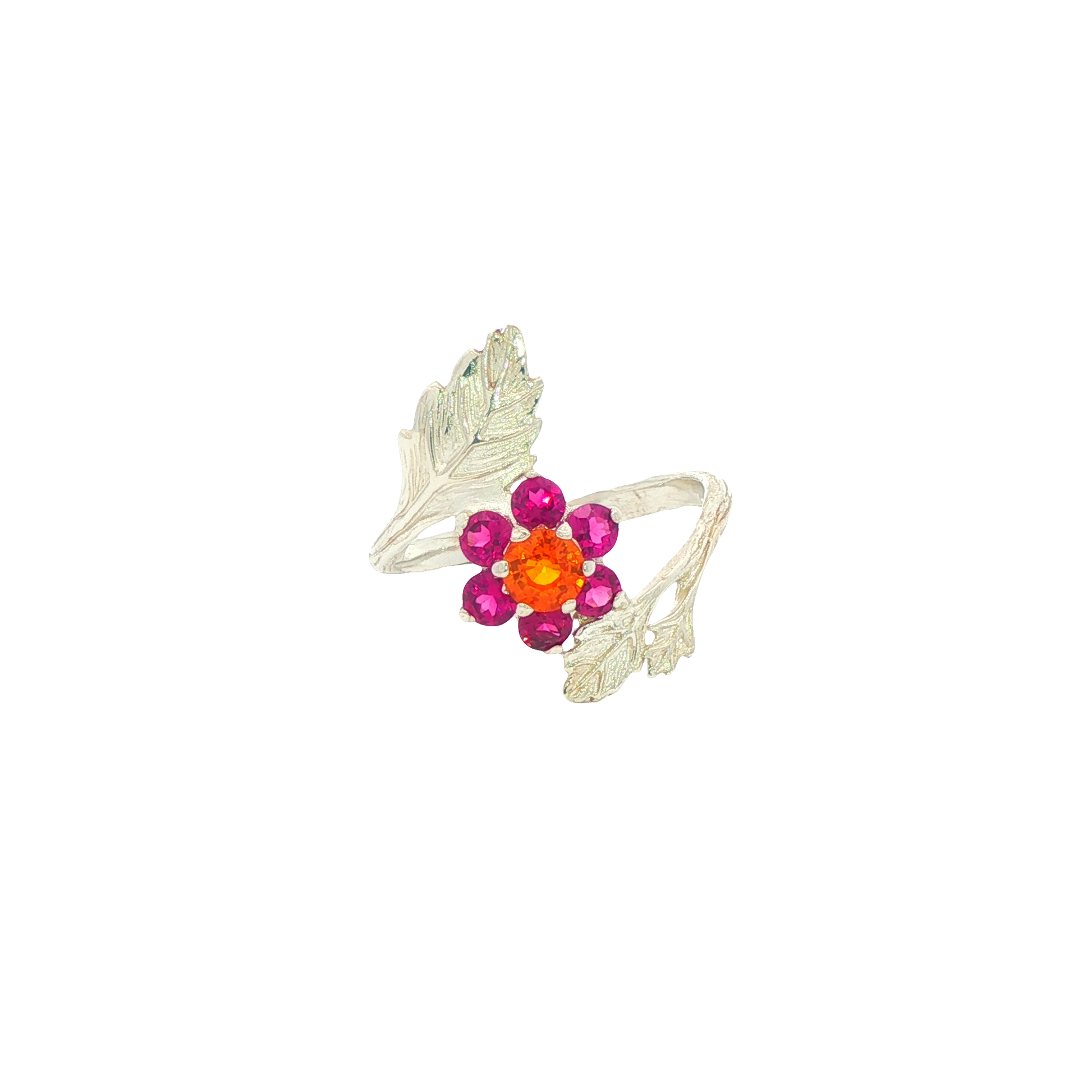 Embrace nature's elegance with this enchanting .22 pt orange sapphire and six .08 pt each Umbalite garnet ring. The open-shank band, crafted from sterling silver, cradles a purplish garnets in a round brilliant cut sapphire. The band culminates in delicate leaf motifs, adding a touch of whimsical charm. This ring is a captivating testament to refined beauty and nature-inspired design.