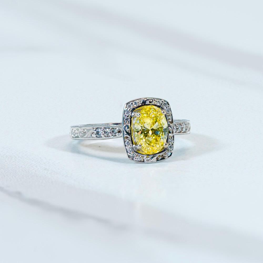 A gorgeous certified 1.01 carat fancy VVS-1 vivid yellow chemical vapor Diamond (CVD -Lab-grown) Diamond surrounded by natural mined Diamonds set in a decorative 14k white gold mounting. Pictured in size 7.