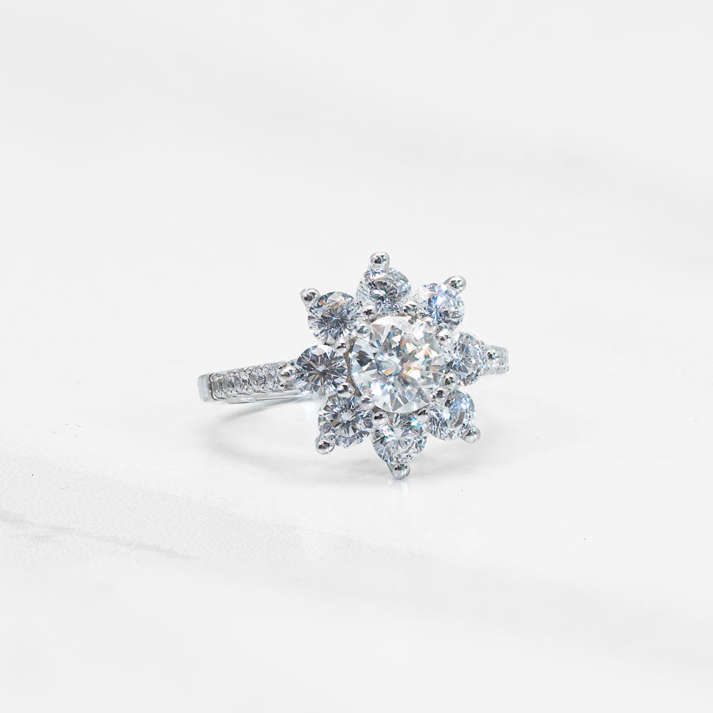 2.50 carats total weight white Moissanite in an accented blossom setting in Sterling Silver with a platinum overlay to negate tarnishing. Pictured in a size 7.