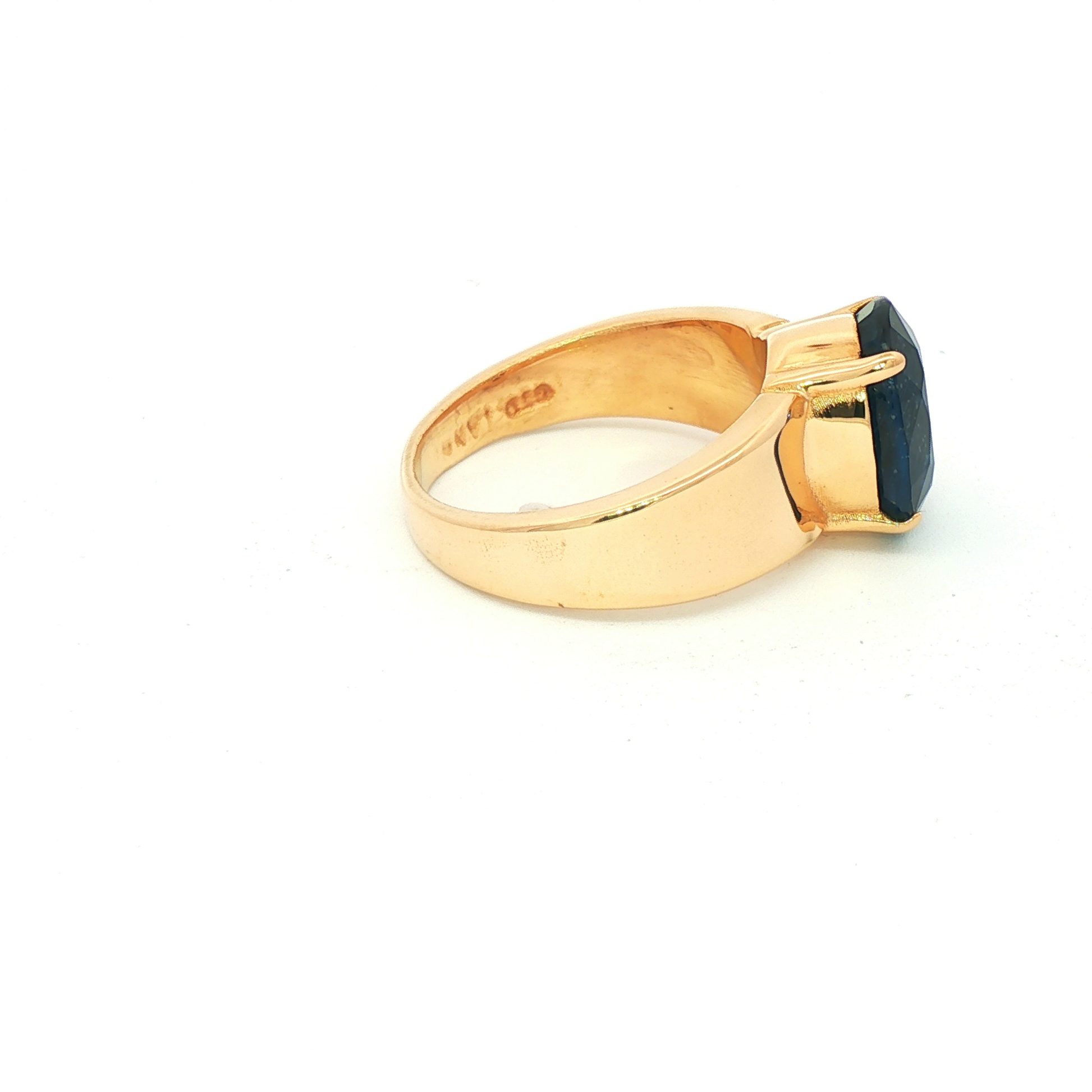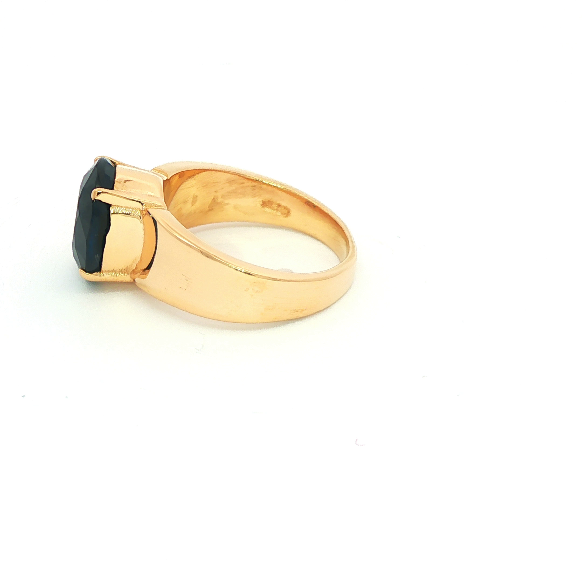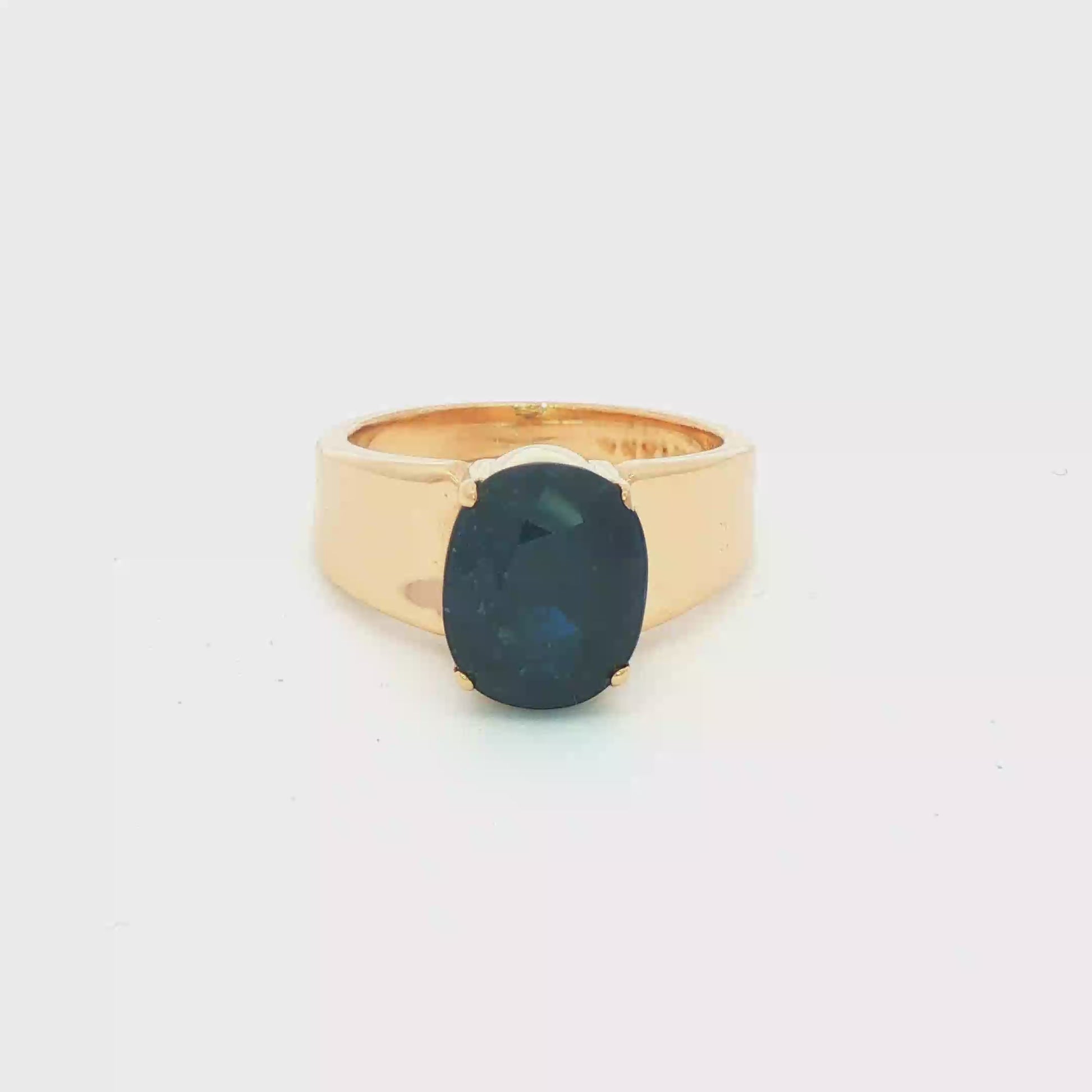 Indulge in the timeless elegance of this exquisite ring, crafted in lustrous 14k yellow gold. The centerpiece features an oval 5.18ct Australian sapphire, its deep blue hue captivating the eye. A striking statement piece that effortlessly combines classic design with a touch of modern sophistication, perfect for adding a refined touch to any ensemble.