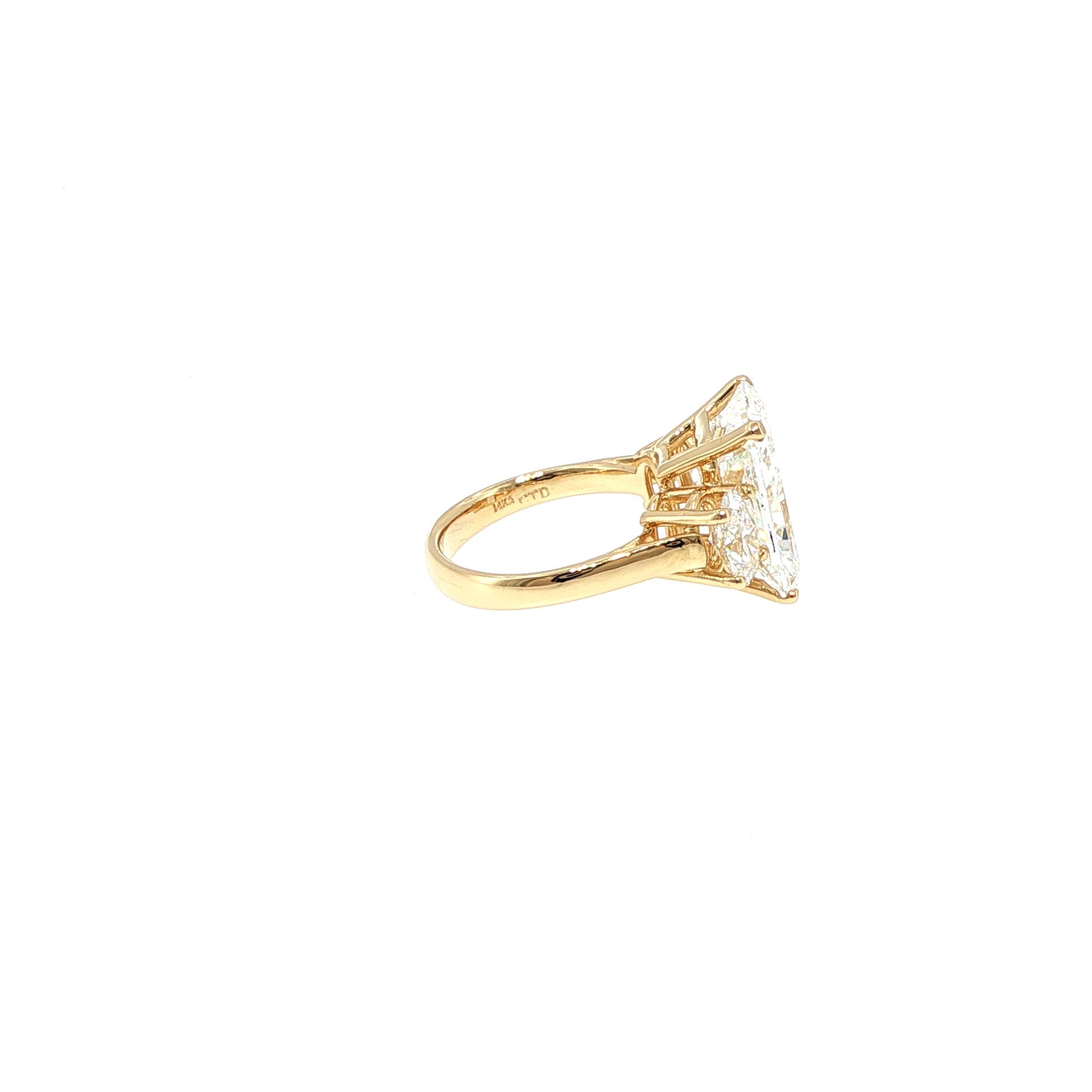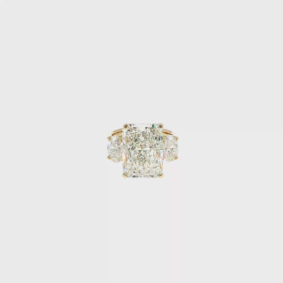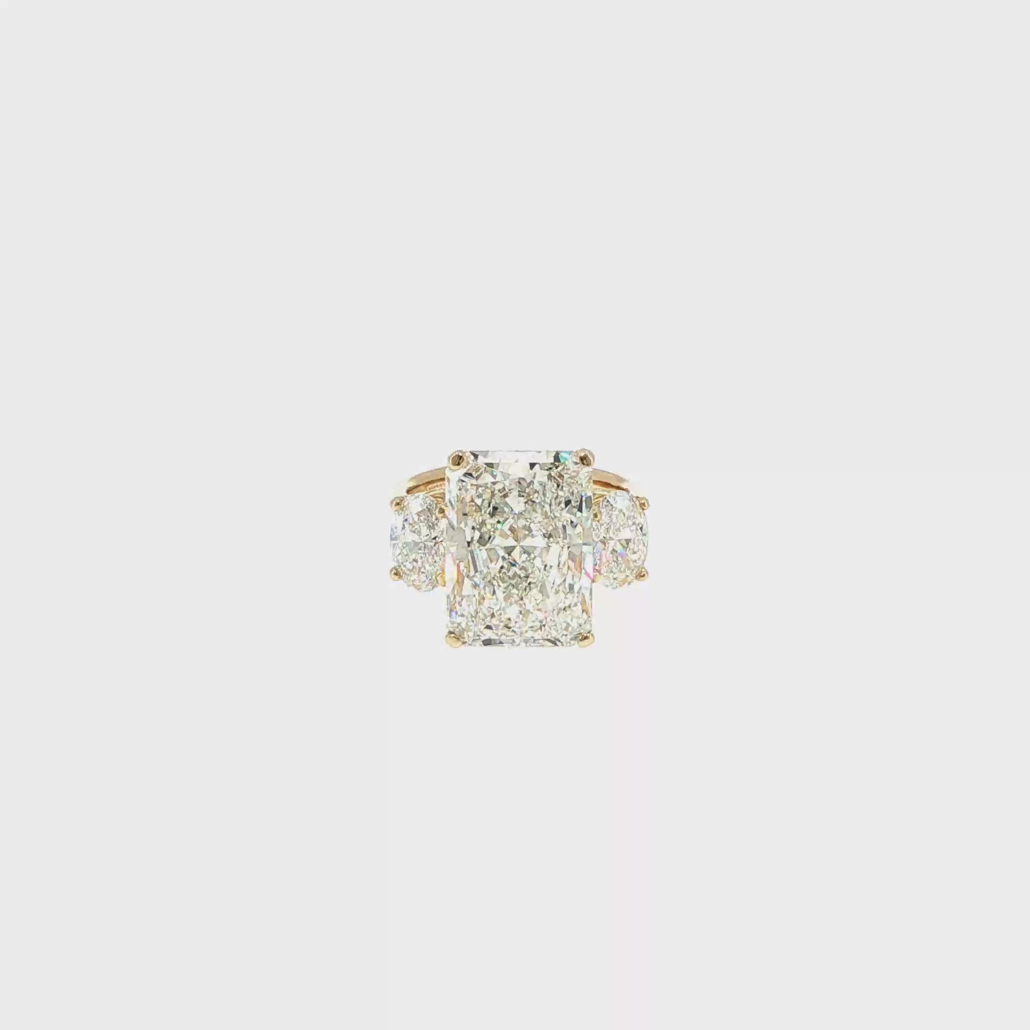 This exquisite showcase ring features a stunning radiant cut 10ct lab-grown CVD VVS2 E-color diamond at its center, showcasing exceptional brilliance and a sophisticated rectangular profile. Two oval VVS2 E-color 1ct (each) side diamonds adorn the mounting. Crafted in luxurious 14K yellow gold, the polished band offers a classic warmth that complements the colorless sparkle of the stone. The design incorporates a secure four-prong setting, ensuring maximum light exposure for superior fire and scintillation. Perfect for an elegant proposal, this ring combines timeless style with professional craftsmanship and a clean, symmetrical aesthetic.