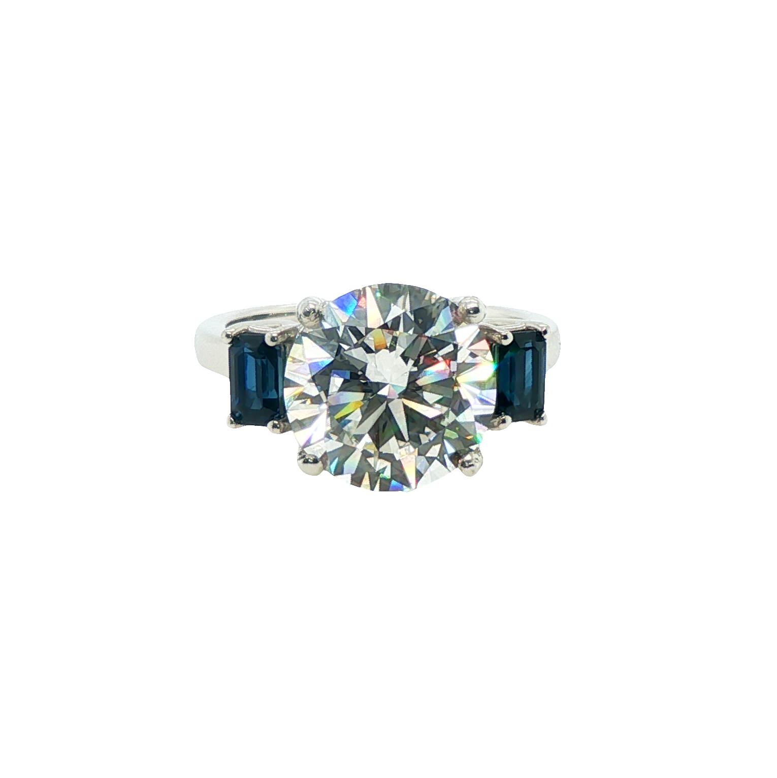 This exquisite platinum ring features a breathtaking round brilliant cut VVS 2, E color, 5.02 ct CVD lab grown diamond at its center. Accentuating the design are two step cut royal blue natural triple A quality sapphires. The meticulous symmetry and polish enhance the overall aesthetic, creating a sophisticated and timeless heirloom ring.