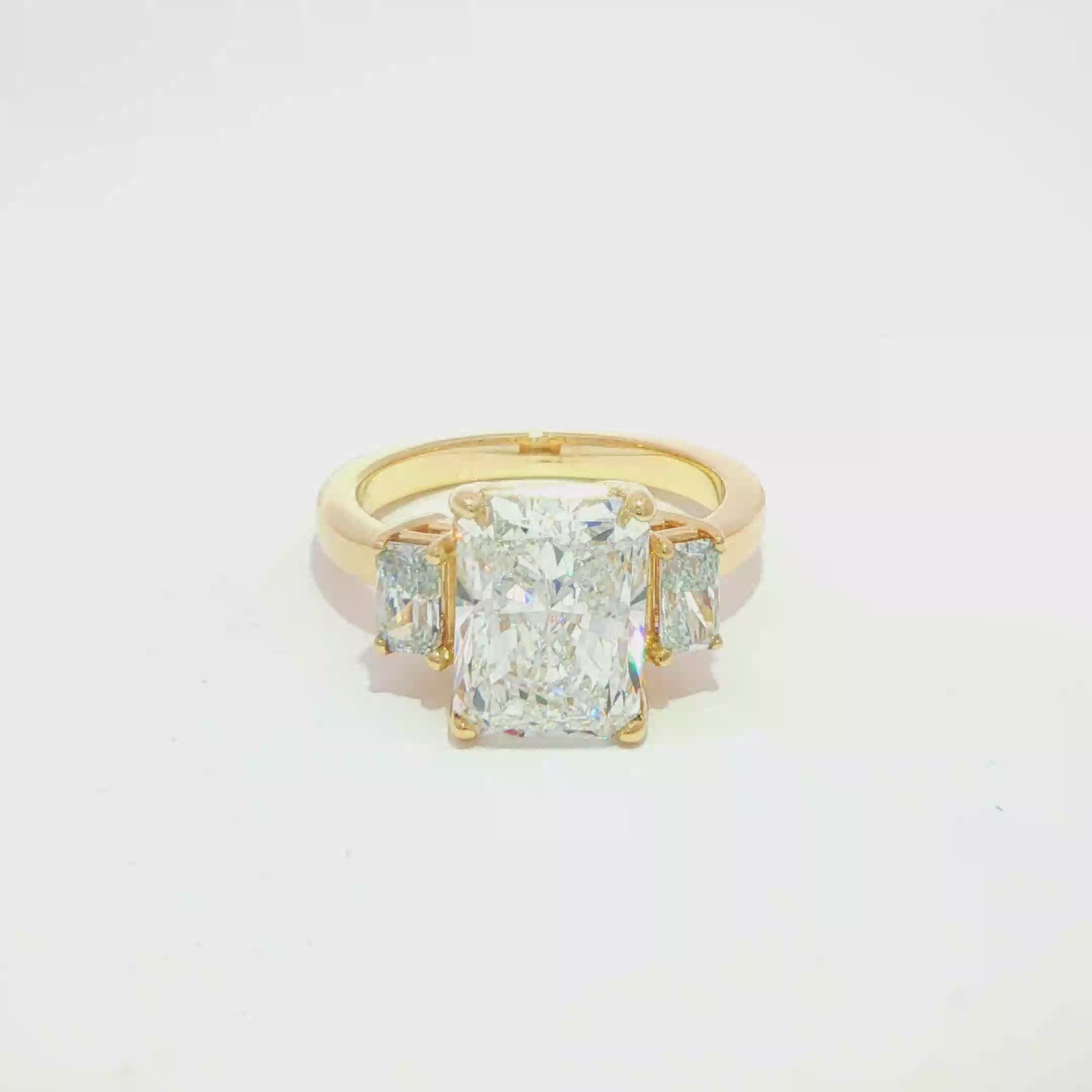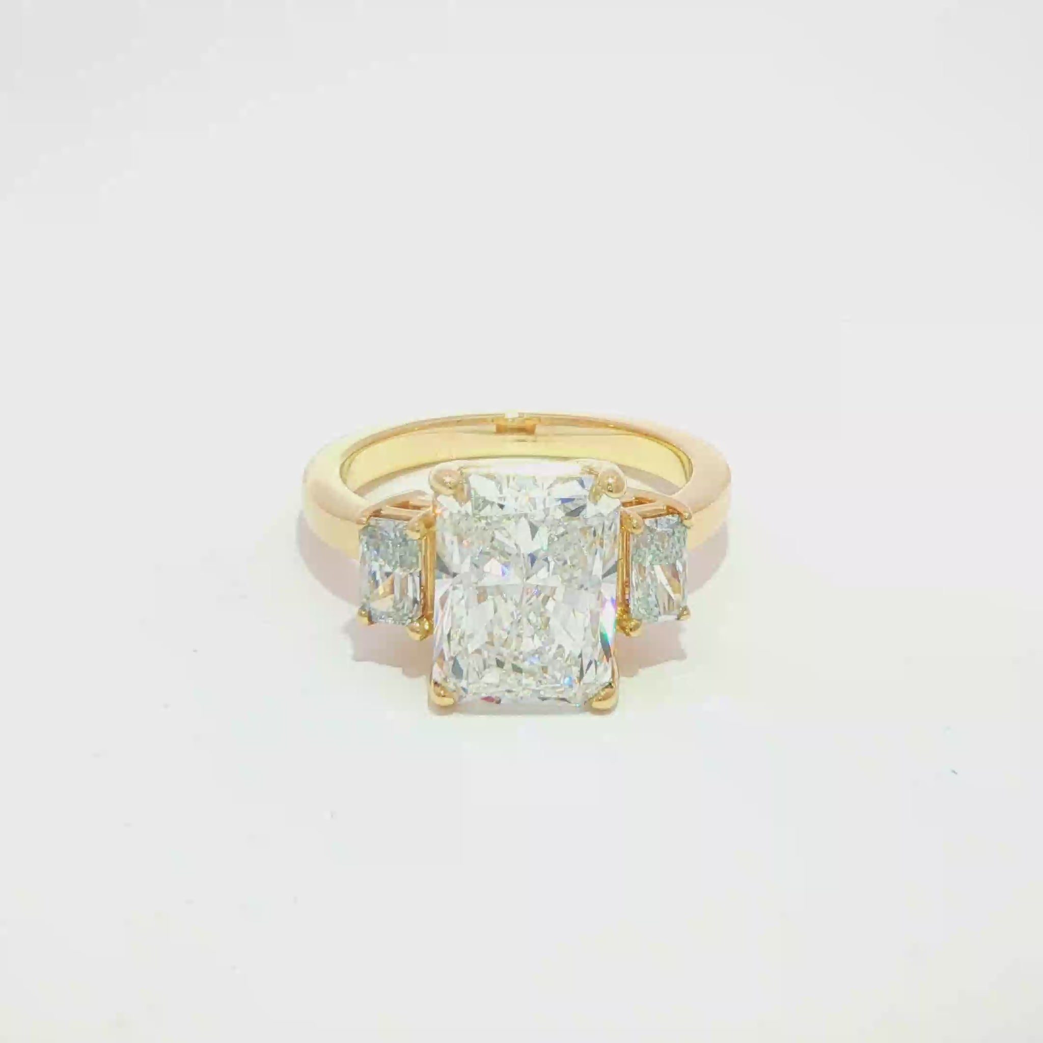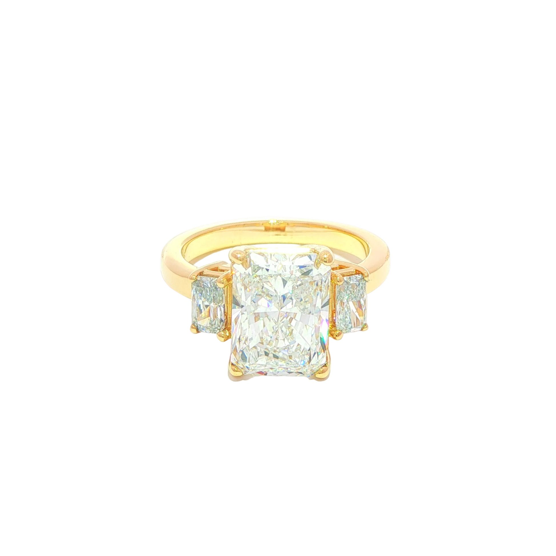 Elevate your style with this exquisite three stone diamond ring, crafted in vibrant 14k yellow gold. The ring features a mesmerizing center radiant cut 4.09ct, VVS2, E color diamond with exact matching accent stones, showcasing a brilliant cutting style that captures and reflects light with every turn. This fine jewelry piece exudes sophistication, perfect for adding a touch of luxury to any occasion.
