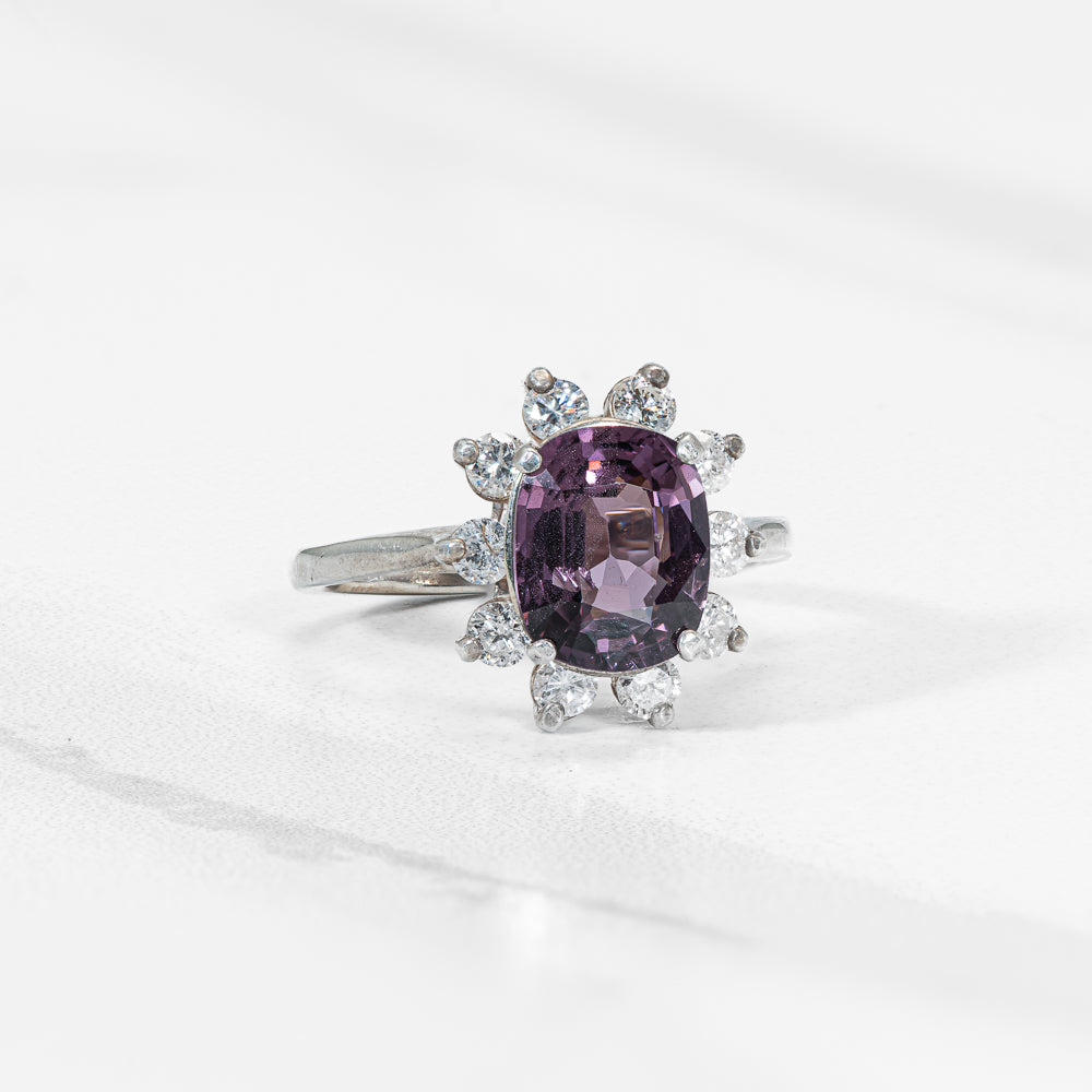 A rare natural 2.75 carat purple/pink Mae Sai Spinel from Myanmar with ten 0.06 pt. natural SI-2 Diamonds in Sterling Silver. Pictured in size 7.