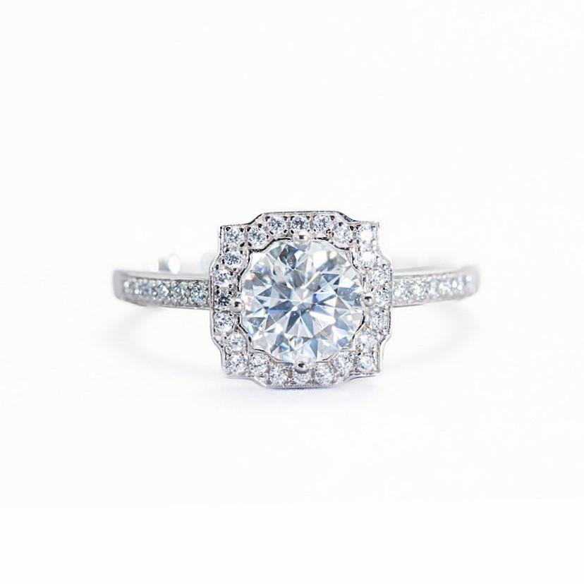 Featuring a stunning 1.00 carat round white Moissanite in a decorative accented halo setting in Sterling Silver with a platinum overlay to negate tarnishing, the total stone weight is 1.25cts. Pictured in a size 7.