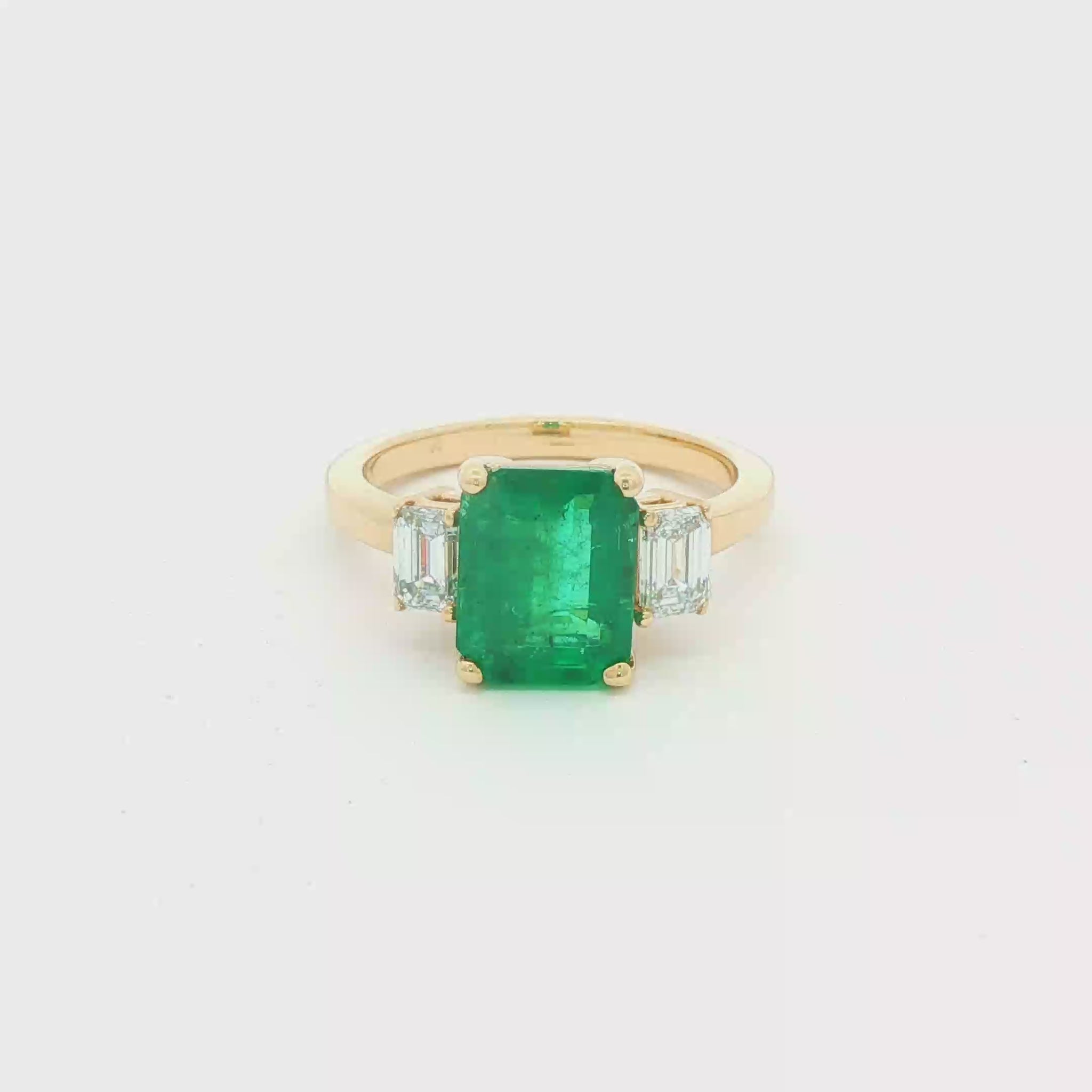 Exquisite Emerald and Diamond ring, expertly crafted in radiant 14k yellow gold. This ring features a natural 2.52ct Zambian emerald, known for its step cut, exhibiting a vivid green hue, and is accompanied by two 0.37pt VVS2, E color lab-grown diamonds. A testament to timeless elegance, this gemstone ring is a striking addition to any fine jewelry collection.