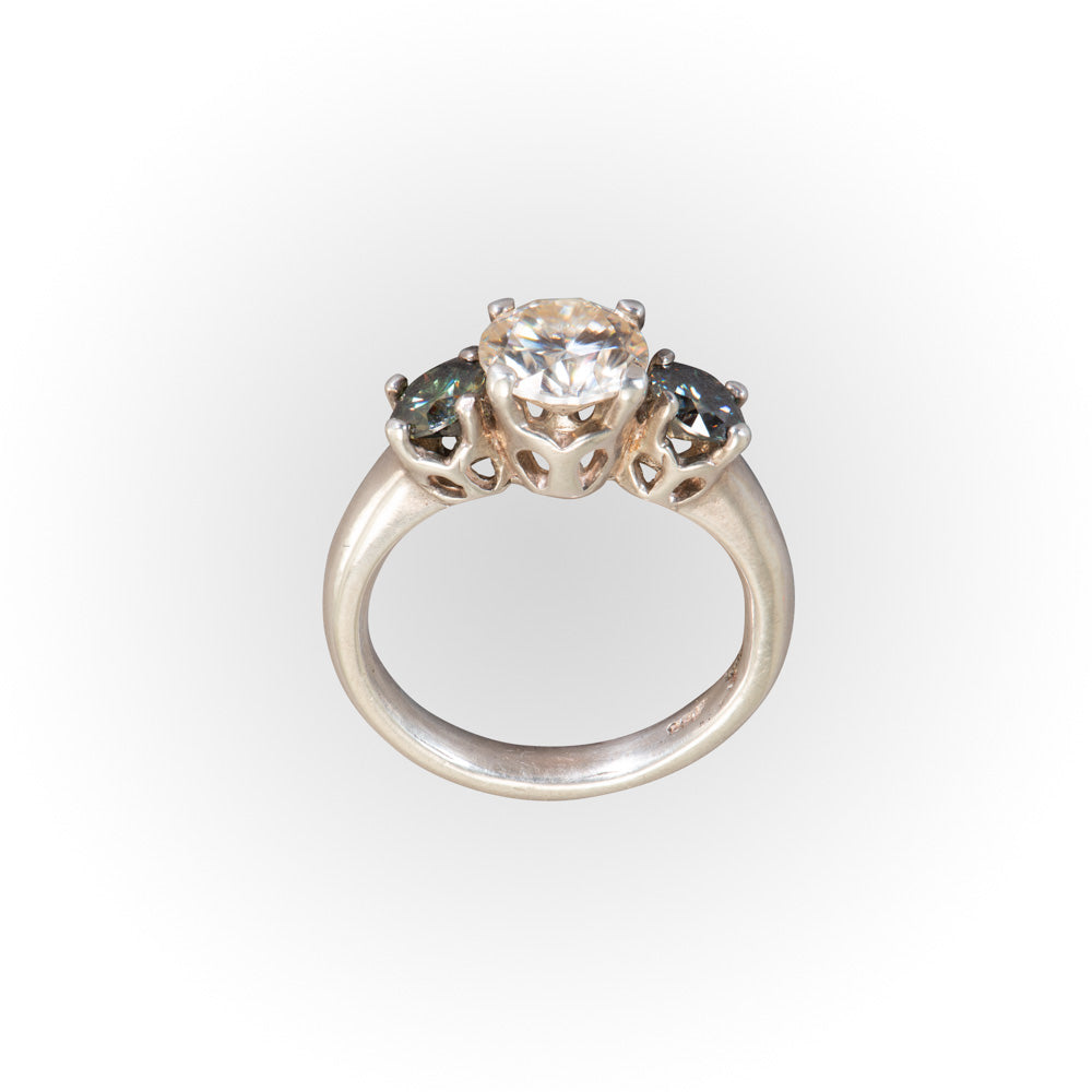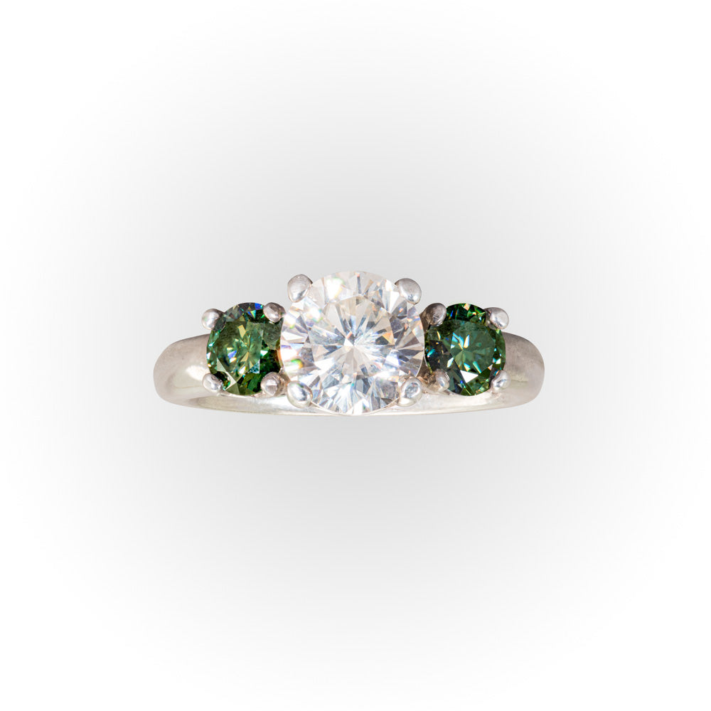2.00 carat fancy yellow center stone Moissanite with two 0.50 carat blue green Moissanite side stones in Sterling Silver. Pictured in a size 7.